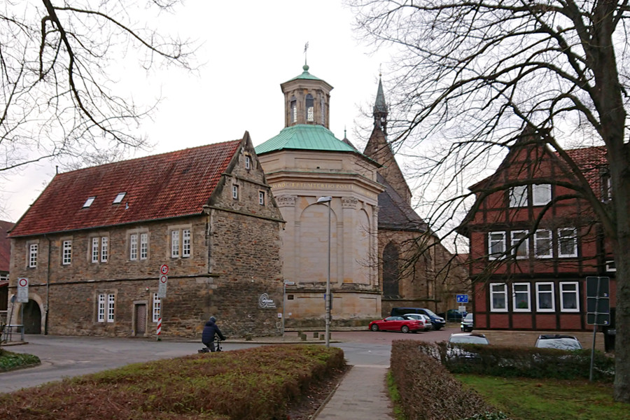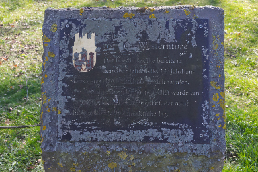Im 14. Jahrhundert wurde die mittelalterliche Stadt Stadhagen durch eine Befestigungsanlage geschützt. Es gab einen hohen Wall, einen Graben und verschiedene Tore. Viel ist davon nicht übrig geblieben, aber die Wallanlage, die jetzt viel niedriger ist, wurde zu einem Spazierweg mit vielen - auch nichtheimischen - Bäumen bepflanzt, es gibt Spielplätze und Bänke. Insgesamt ist der Rundgang zweieinhalb Kilometer lang. Wir haben noch hier und da Abstecher gemacht und sind das letzte Stück durch die Innenstadt gelaufen.