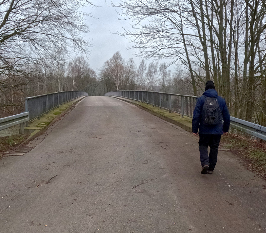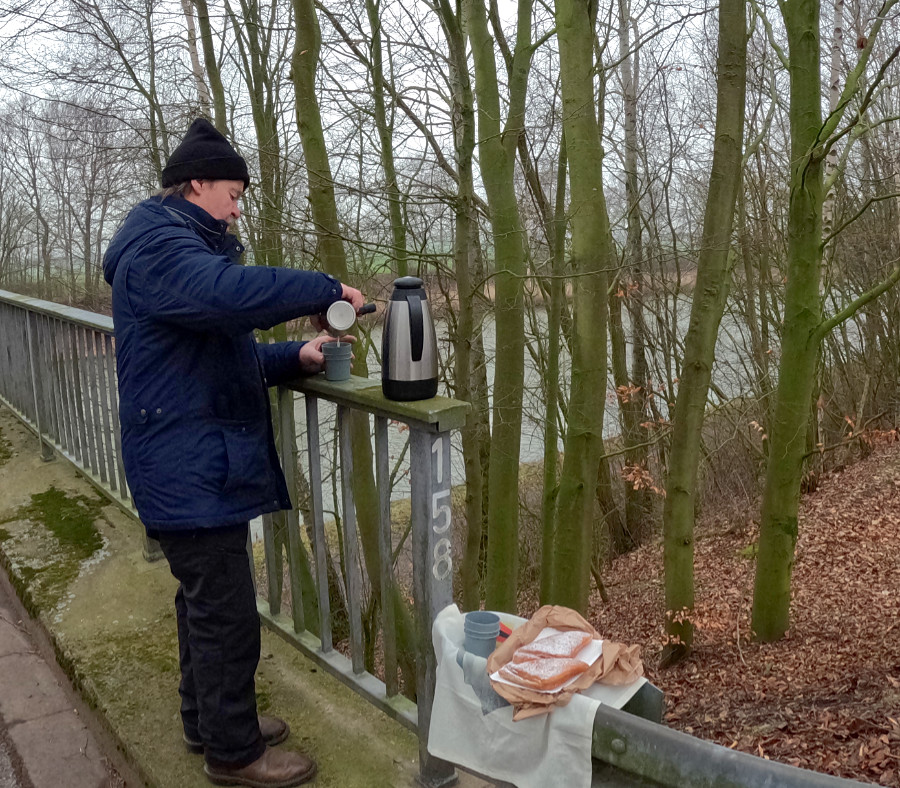 An der nächsten Brücke war unser Kehrpunkt, wir liefen auf der anderen Seite zurück. Vorher machten wir eine kleine Kaffeepause mit einem Kirschteilchen. Wir hatten Glück ein Kaffeebecher segelte den Abhang hinunter.