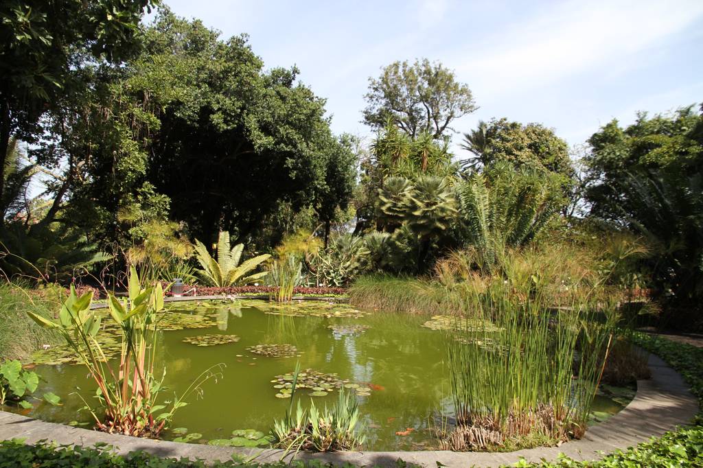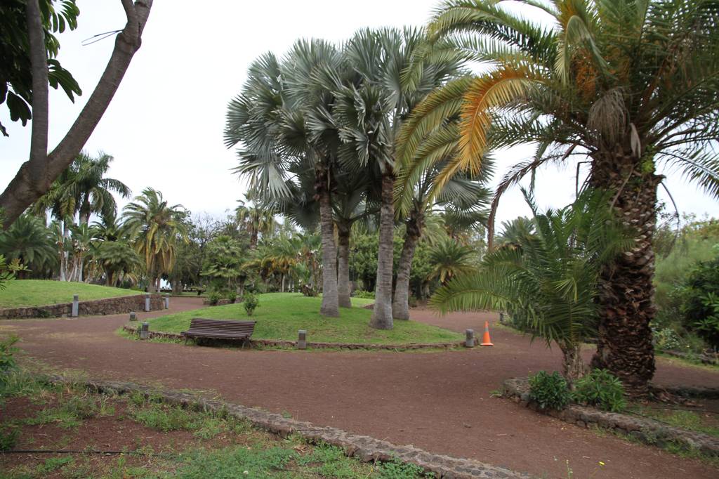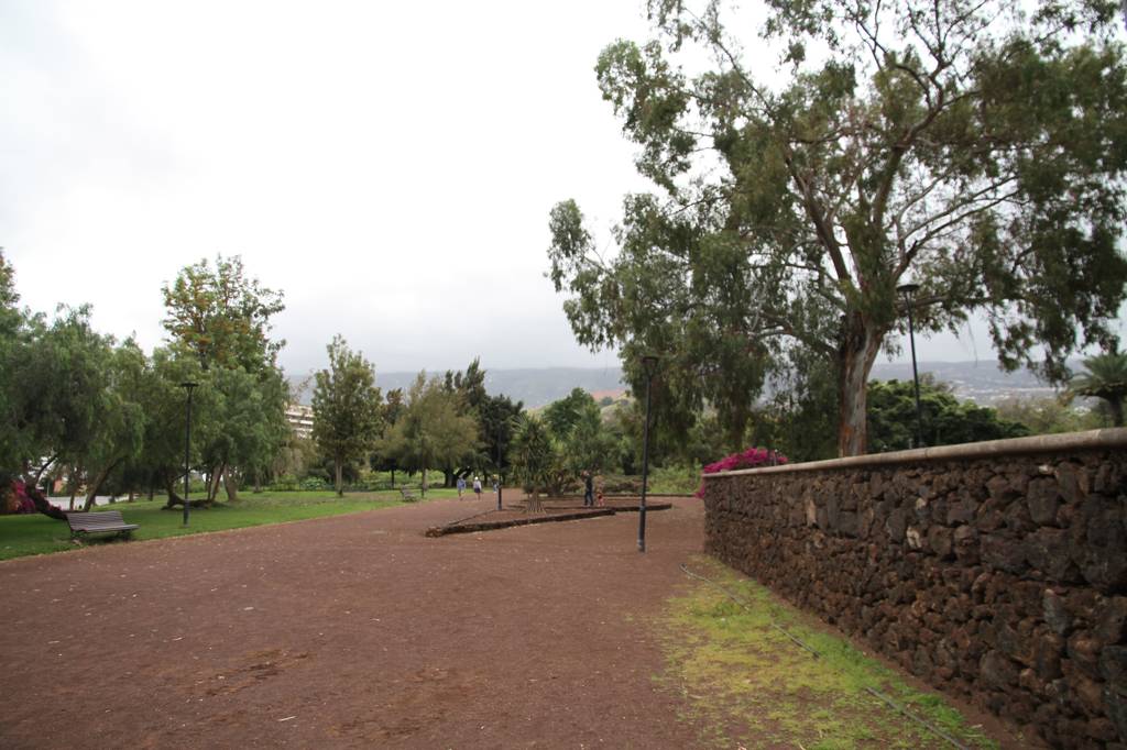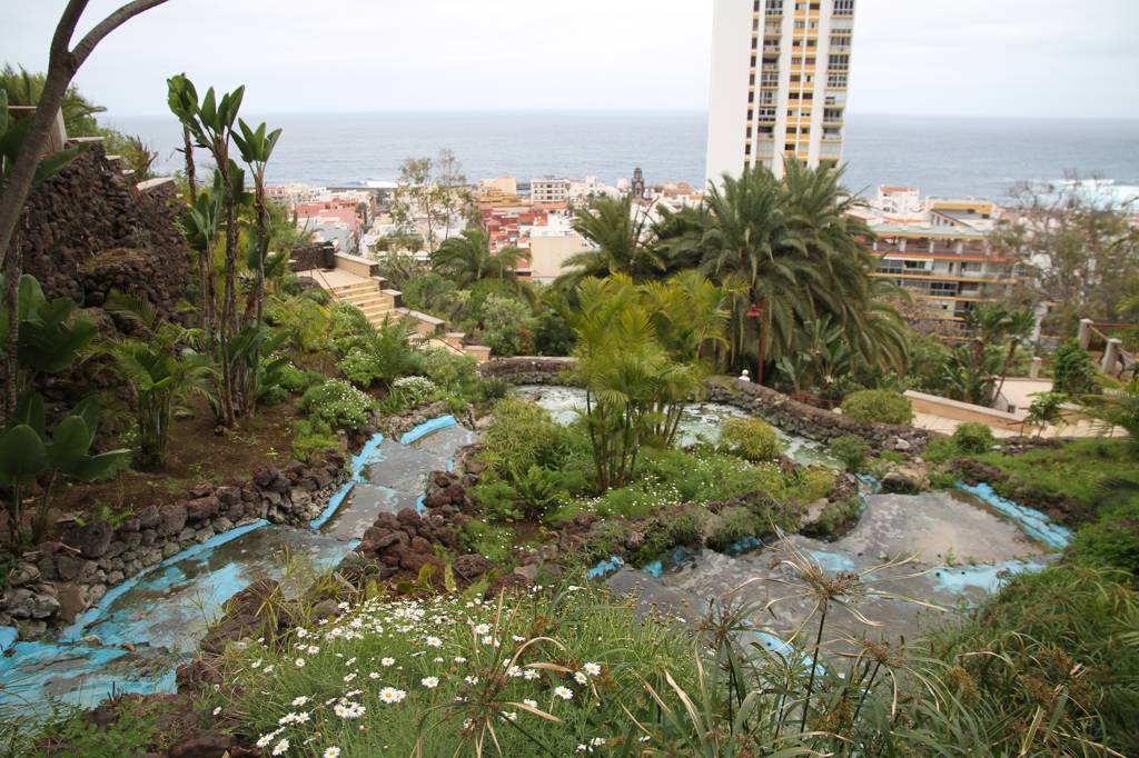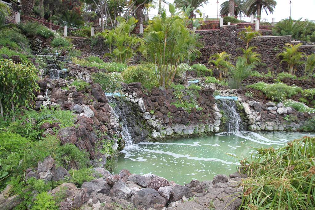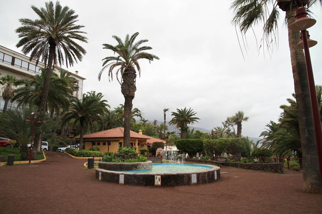DIrekt neben dem AUssichtspunkt liegt das ehemalige Gran Hotel Taore. Es war das erste Luxushotel auf Teneriffa und ist heute eher ein Lost Place - allerdings finden aktuell Instandsetzungsarbeiten statt. Ende des 19., Jahrhundert wurde es eröffnet und es kamen vor allem Engländer, die einen gewissen Luxus genossen, wie Strom und fließendes Wasser. Während der der Stadt zugesandte Parkteil in den ABhang integriert ist und eben die Wasserfälle aufweist, ider der Park auf der anderen Seite des Hotels mit vielen Bäumen versehen und großflächig. Auch hier gibt es Wasserbecken, aber die sind heute alle leer. Jan erinnert, dass wir hier schon einmal waren und in einem der Becken hätte es viele Schildkröten gegeben...