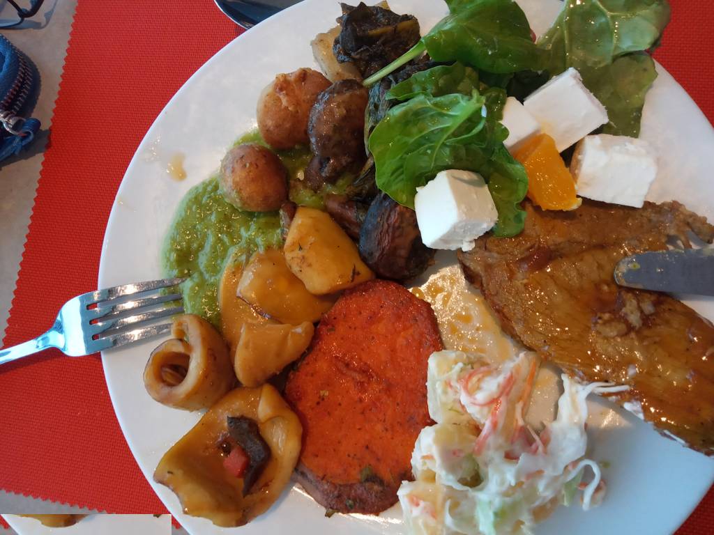 Meinst Du? Auf unseren Tellern ist ja immer nur eine kleine Auswahl. Keine Nudeln, Reis, Pommes (Ausnahme bei Jan am ersten Abend, als alles sehr ausgesucht war). Bei mir 80Prozent was Grünes, bei Jan ist es anders herum. Und zum Nachtisch jede Menge Obst. Und ein kleine Schälchen Milchreis, Vanillepudding. Ich finde das sehr moderat.