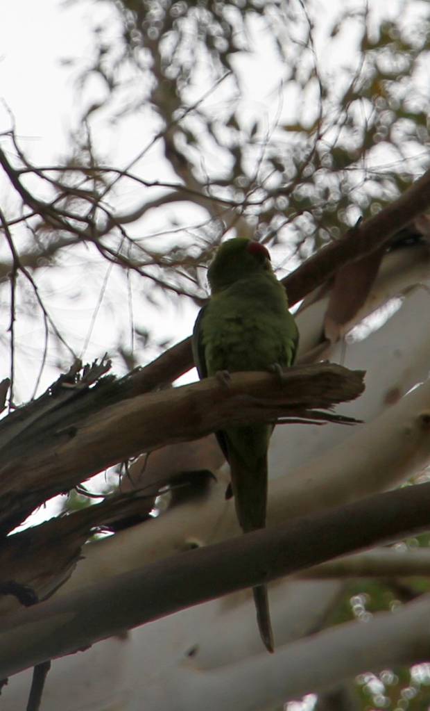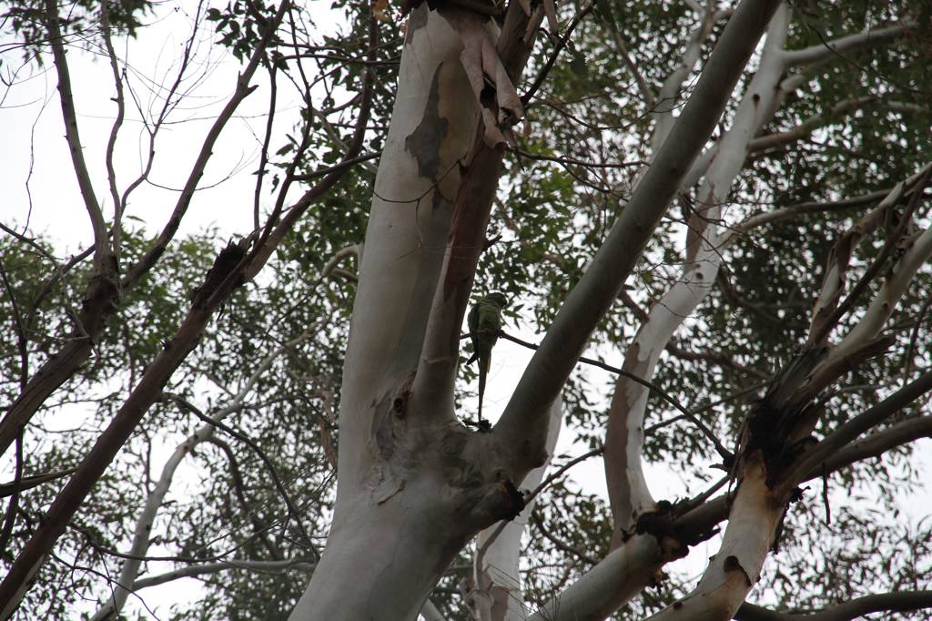 Und hier gibt es Papageien in den Bäumen - leider habe ich das Teleobjektiv nicht mit und die Viecher fliegen dauernd hin und her - aber vielleicht kann man den hier erkennen