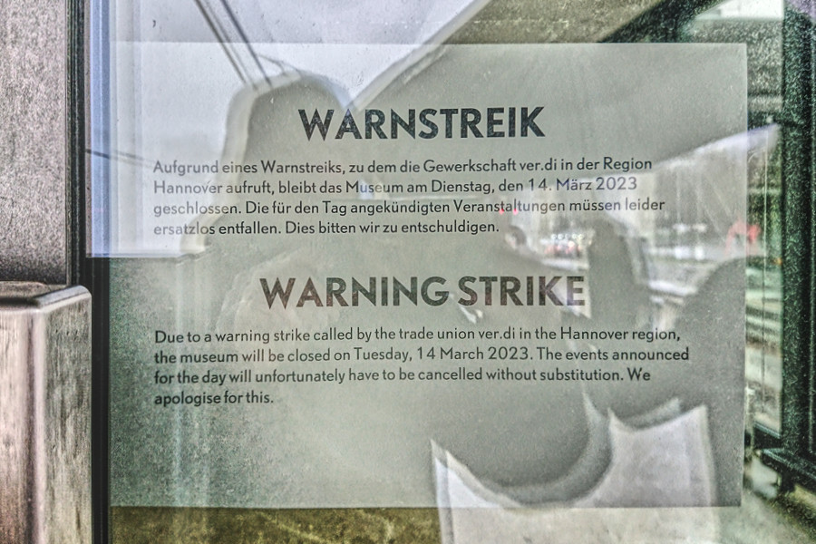 Dass wir mit dem Auto nach Hannover fahren mussten, das war ja kein Problem, dass wir zu Fuß zum Sprengel Museum gingen und fast klatschnass wurden, das nahmen wir auch in Kauf. Aber dass das Museum wegen des Streiks geschlossen war und nicht nur wir vor dem verschlossenen Eingang standen, das war schon eine herbe Enttäuschung. Denn auf der Webseite stand nichts davon.