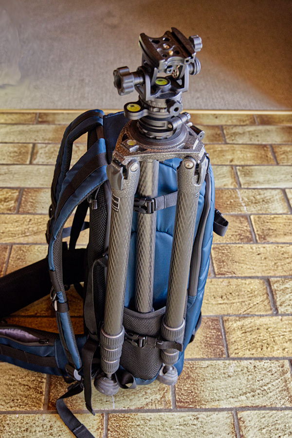 Mein schweres Stativ passt nicht auf die Rückseite, das ziegt den Rücksack ganz schön nach hinten. Mein kleines Reise-Stativ würde passen, doch meist nehme ich das Große mit. Das kann ich sogar mit Levelling-Base und Stativkopf gut tragen, wenn ich das an der Seite befestige. Ansonsten passt da auch eine Wasserflasche oder anderes rein.