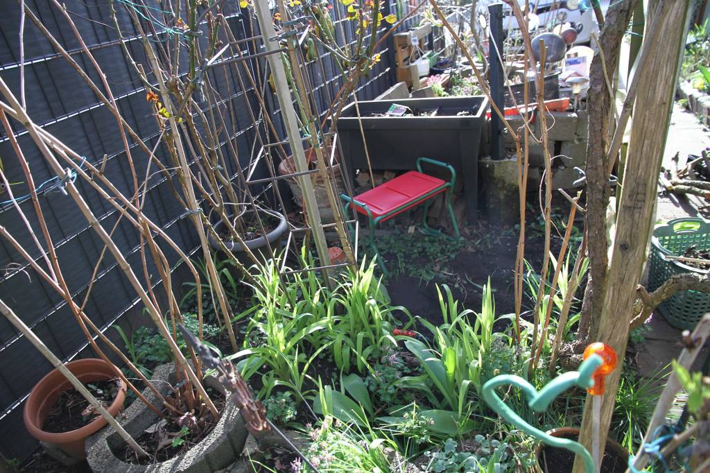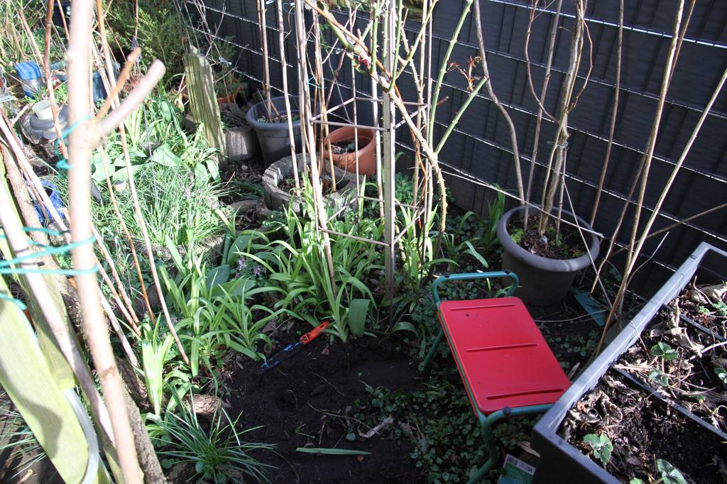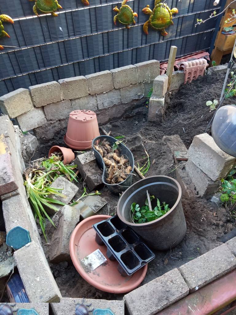 Nebenan steht das Steinhochbeet. Bei dem ist die Wand zum Nachbargrundstück, die durch die dortigen Rüttelarbeiten bei der Herstellung der AUffahrt schon einmal weggekippt war, wieder weggekippt. Möglicherweise haben die Topinambur das auch unterstützt.. die habe ich jetzt alle aus den Steinhochbeet herausgenommen -Jetzt brauchen wir Äste für die untere Lage - ich wollte eh noch den Flieder beschneiden. Hoffentlich schlägt der im Hochbeet nicht wieder aus.... dann kommt ein Rest aus dem Komposter rein und ich schaufel eine Menge Erde aus dem zu reparierenden Teil des Hochbeetes um. Immernoch fehlt die Hälfte - also muss Erde gekauft werden