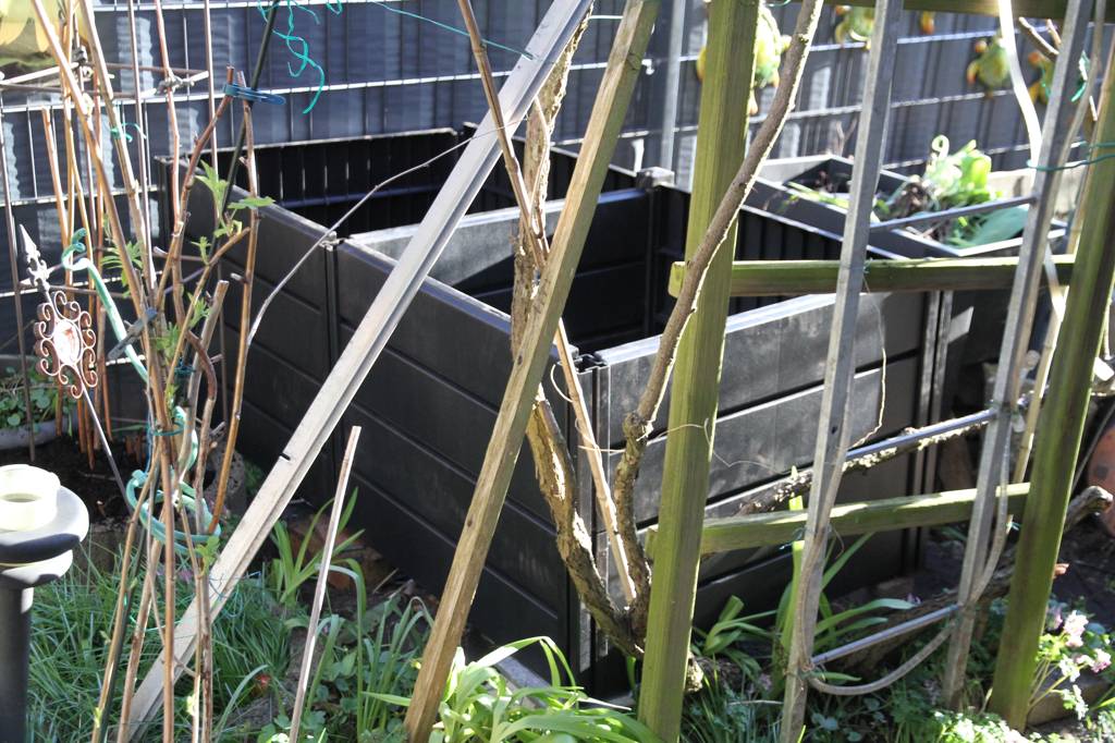 Beim Bogen, an dem Kiwi und Wein wachsen, haben wir ordentlich was runtergeschnitten. Das Beet daneben war immer von Wein und Kiwi überwuchert und die dort stehende Kletterrose mickerte vor sich hin. Nun kam die Idee auf, dort ein Hochbeet hinzubauen. Gesagt getan. Wir haben ein Model von Lidl gekauft aus Kunstoff. Eigentlich ist der AUfbau einfach, wenn aber der Boden nicht eben ist, wird es schwierig, und natürlich ist der Boden uneben - es ist etwas schief geworden aber steht