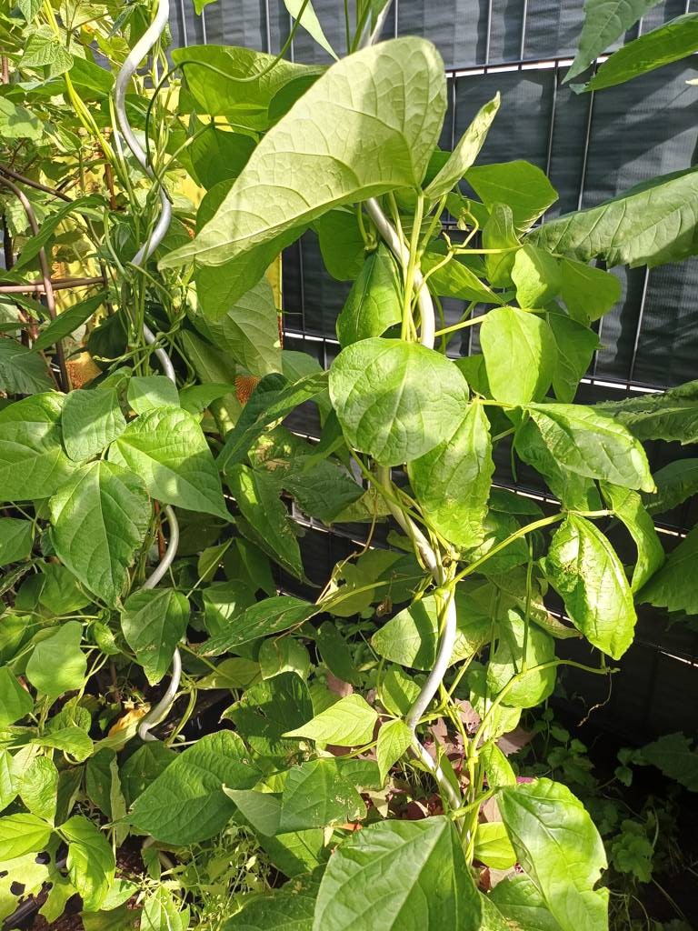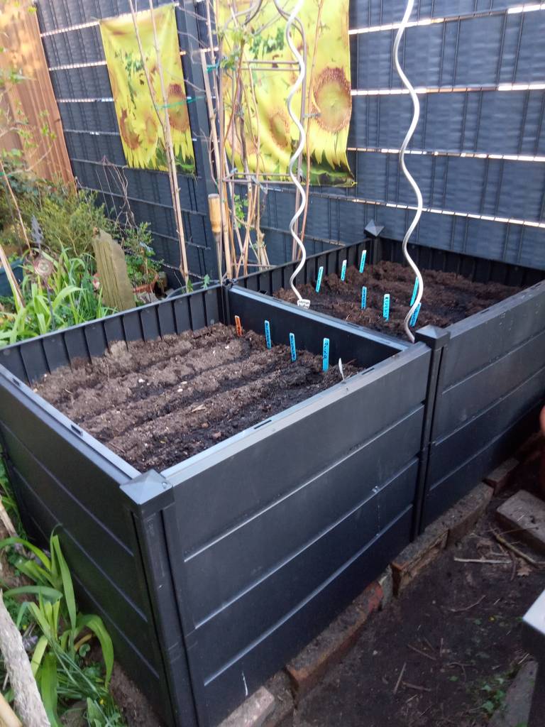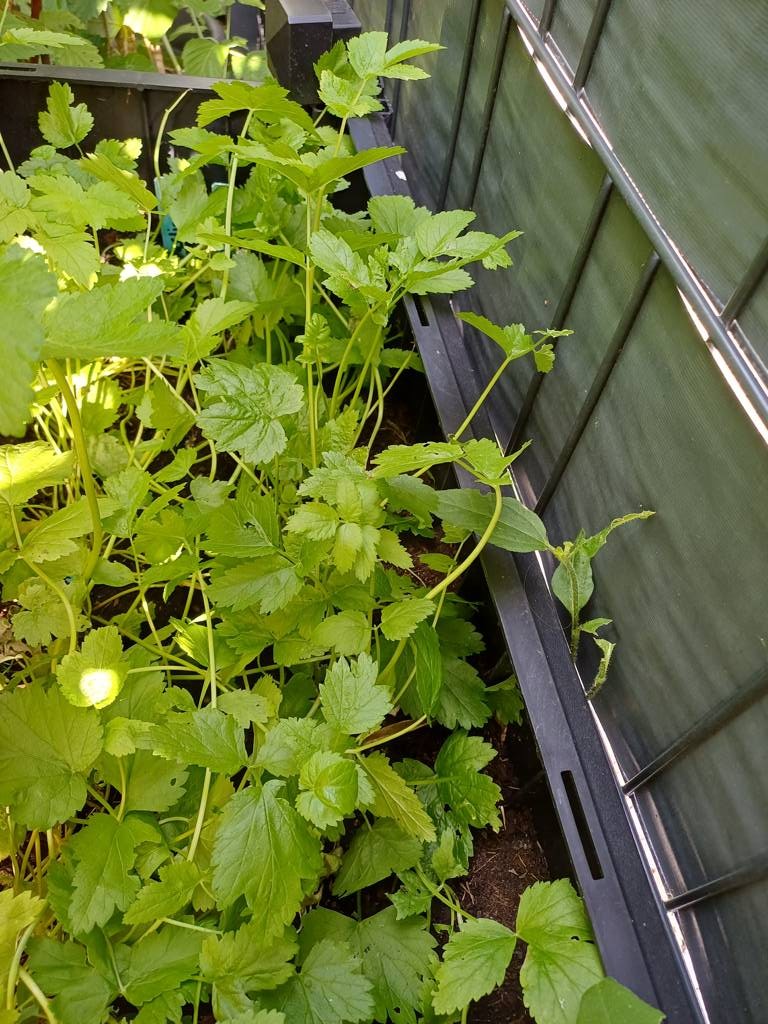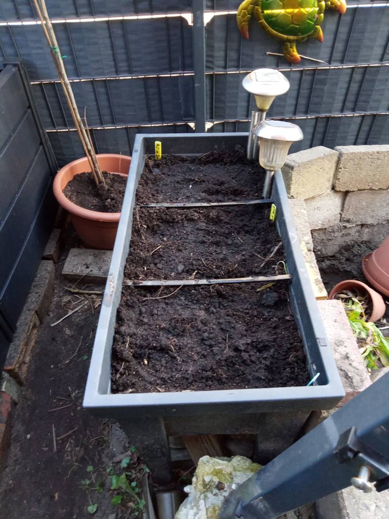 Daneben steht ein kleines Kunststoffhochbeet. Da hatte ich Erdbeeren drin, die aber nicht wachsen wollten - kein Wunder - hinten Wein und Kiwi, vorne riesige Topinambur- kein Licht - also Erdbeeren raus und verschiedene Salate eingesät