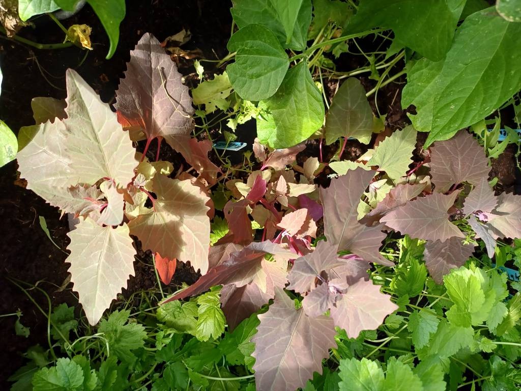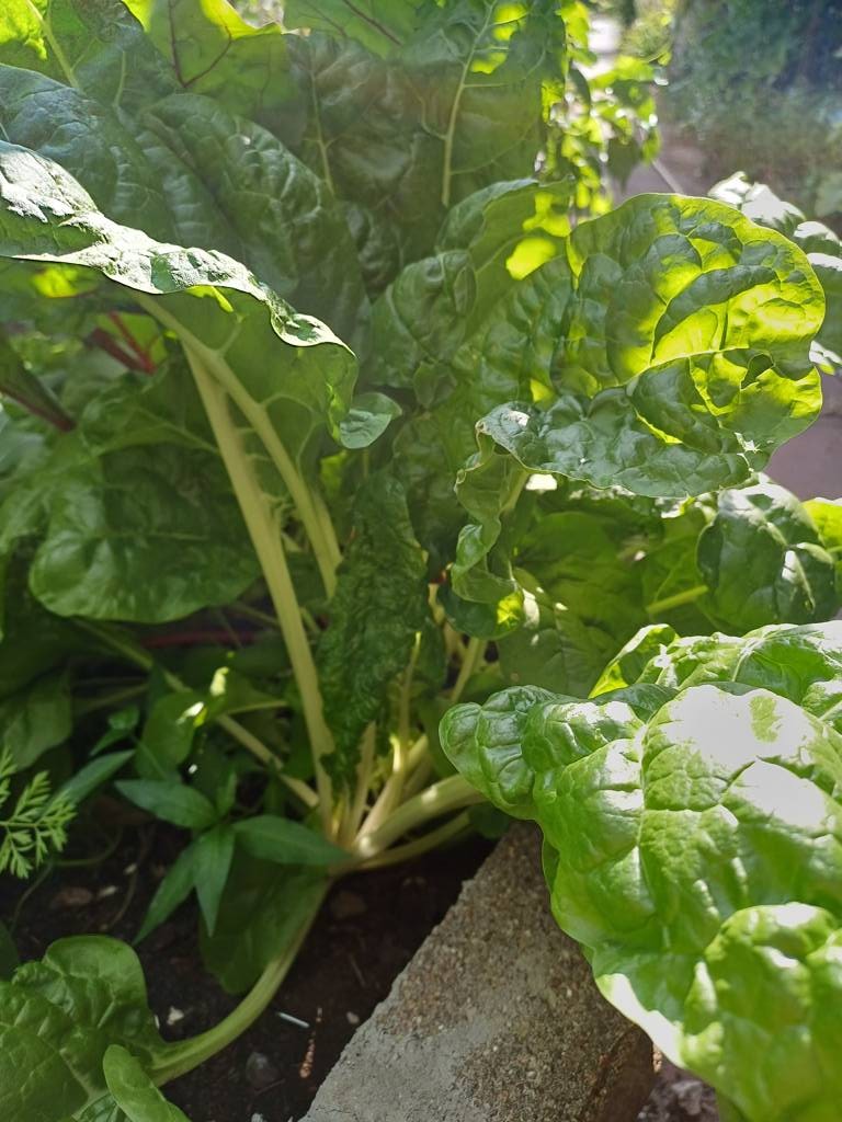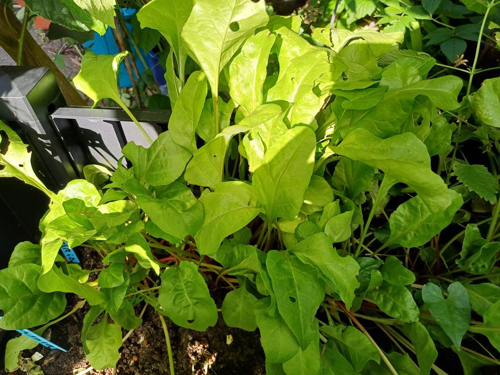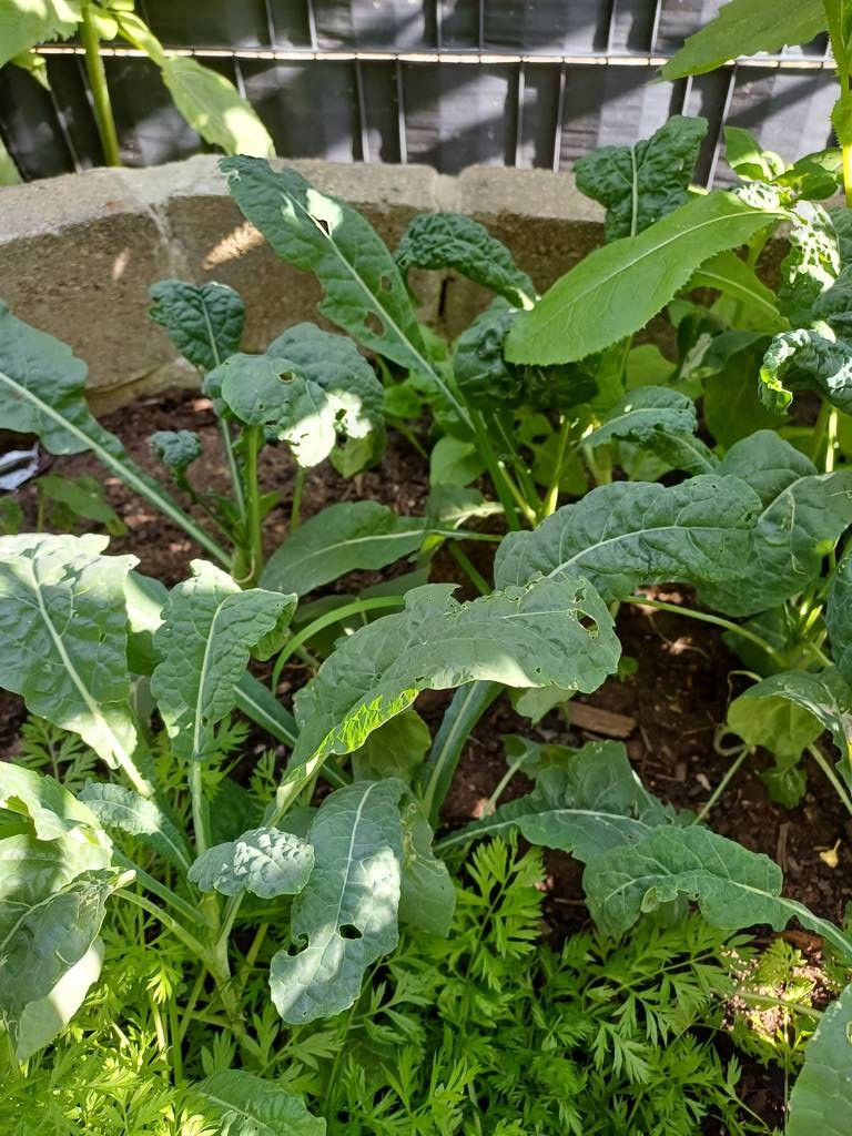 Daneben steht ein kleines Kunststoffhochbeet. Da hatte ich Erdbeeren drin, die aber nicht wachsen wollten - kein Wunder - hinten Wein und Kiwi, vorne riesige Topinambur- kein Licht - also Erdbeeren raus und verschiedene Salate eingesät
