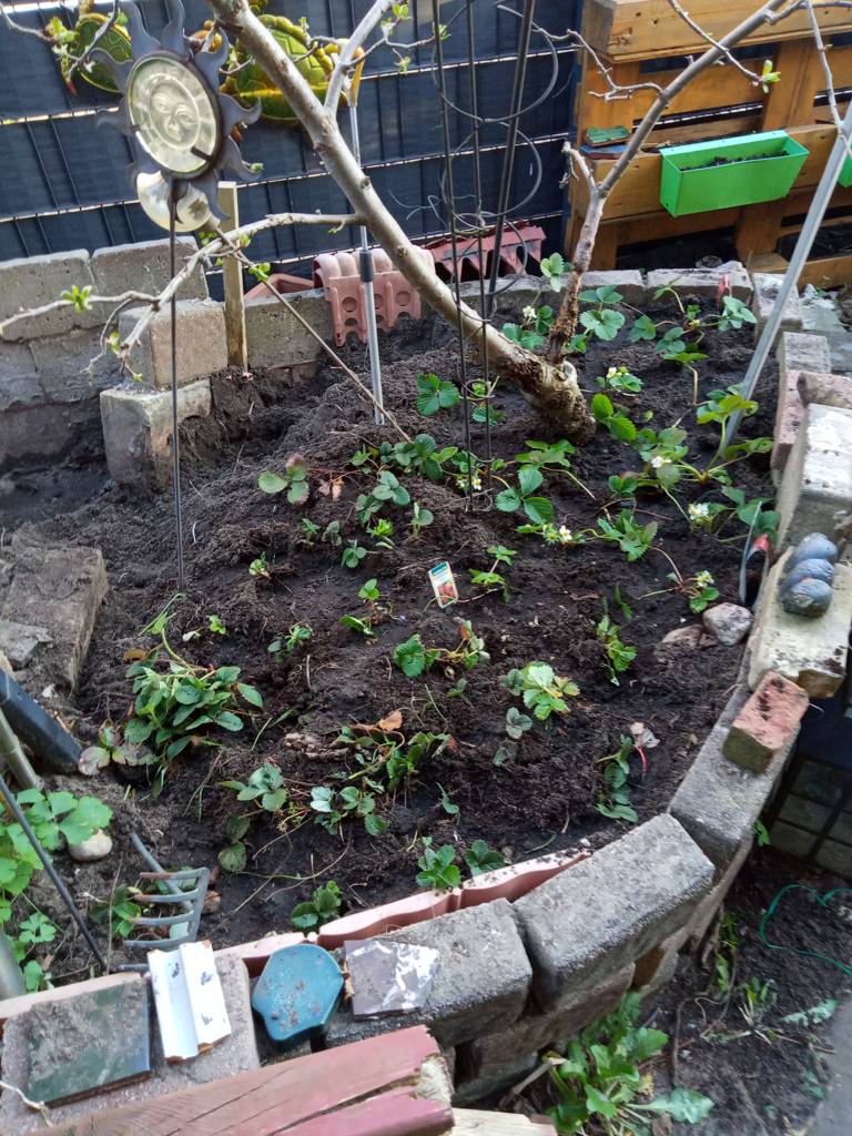 Auf der anderen Seite steht ein Miniapfelbaum und da ist jetzt mein Erdbeerbeet