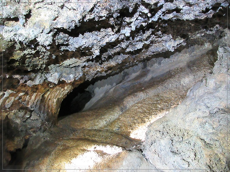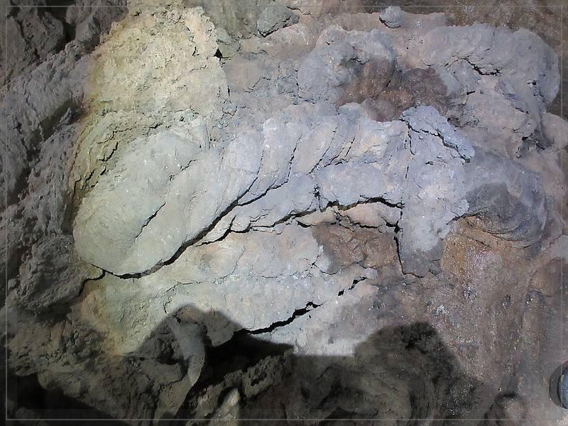 An den Wänden gibt es verschiedene Ausformungen der erkalteten Lava. Das ist z. B. der Typ Pahoehoe, eine basaltische Lava mit einer bizarren, girlanden- bis zopfartigen Oberflächenstruktur.