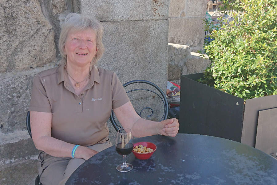 Da ich noch Probleme wegen des Sturzes auf dem Jakobsweg hatte, habe ich mir einen Koffer in Santiago gekauft (mit Rollen) und habe den kompletten Rucksack dort hinein gepackt und nur die wichtigsten Sachen im Tagesrucksack als Handgepäck mitgenommen.