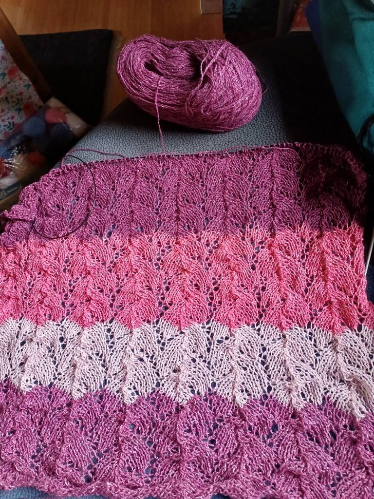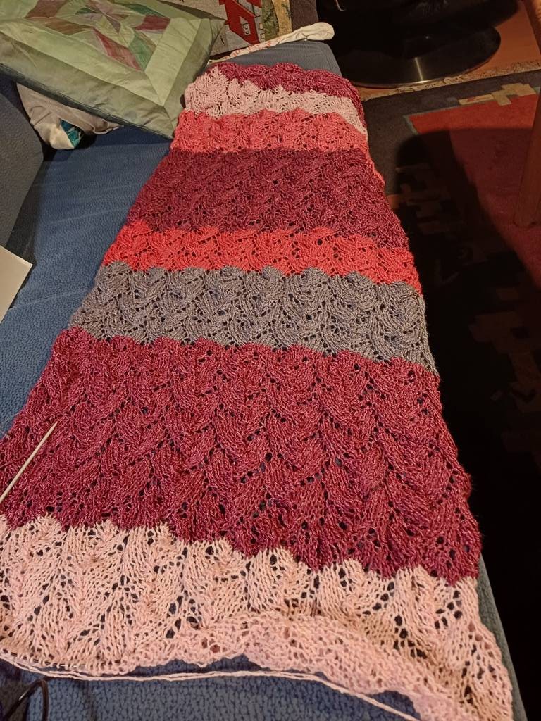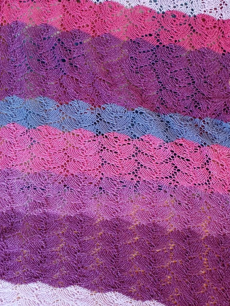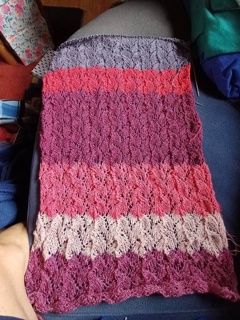 Ich habe mich für einen Schal entschieden mit einem Blattlochmuster.100 Maschen in der Breite. Ein Musterblock hat 12 Reihen