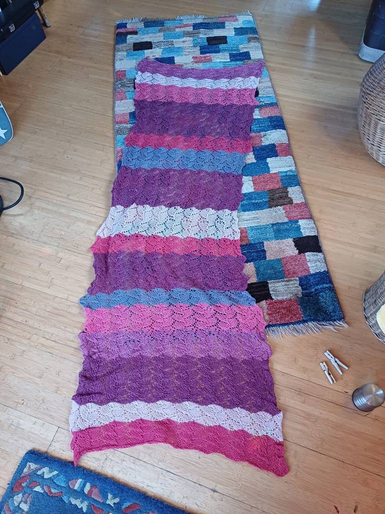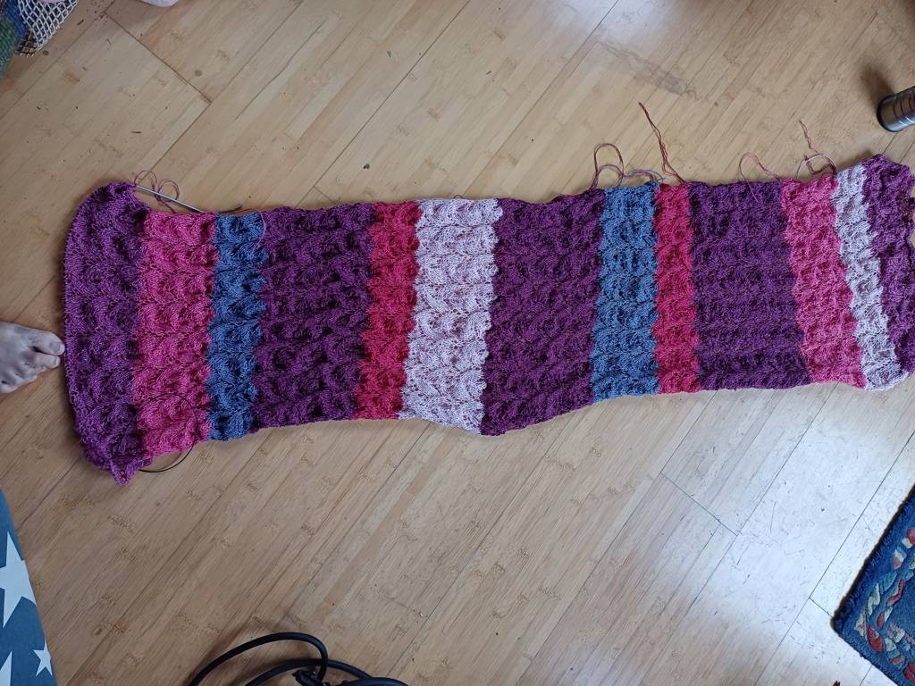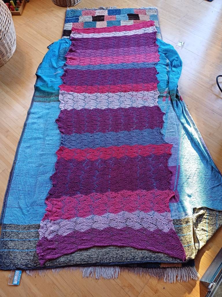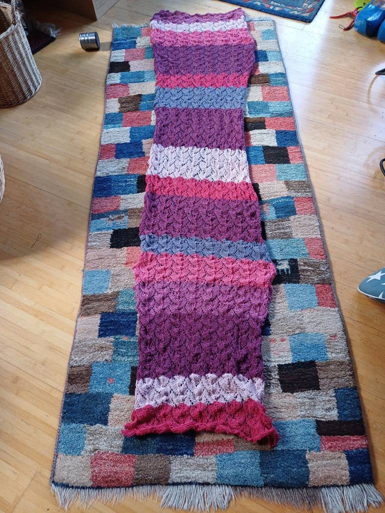 Ich habe mich für einen Schal entschieden mit einem Blattlochmuster.100 Maschen in der Breite. Ein Musterblock hat 12 Reihen