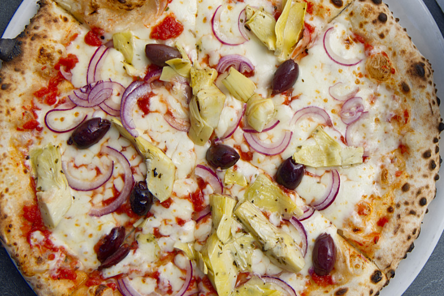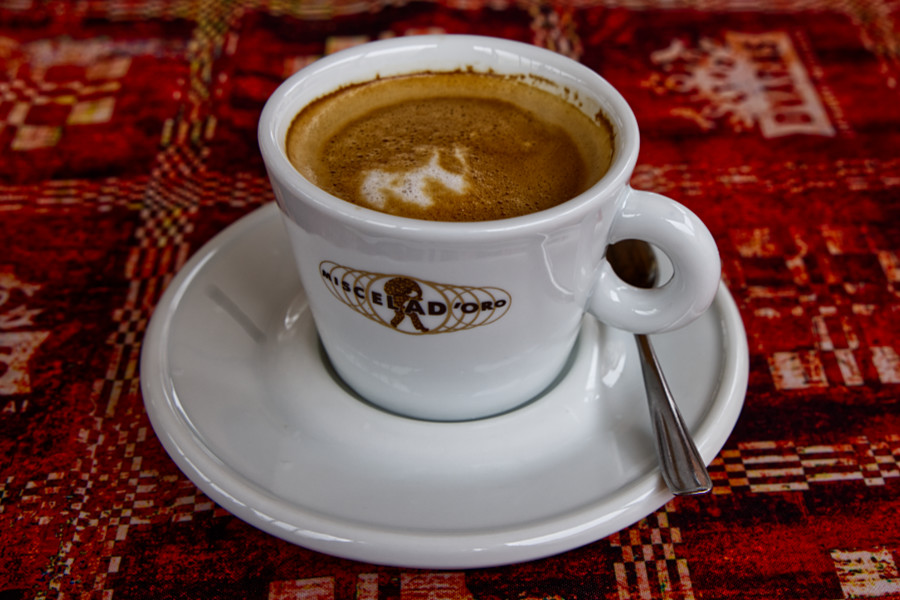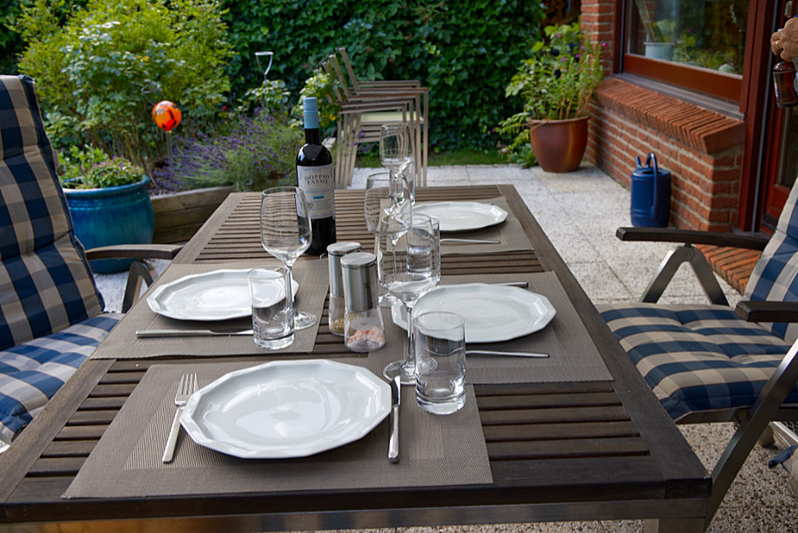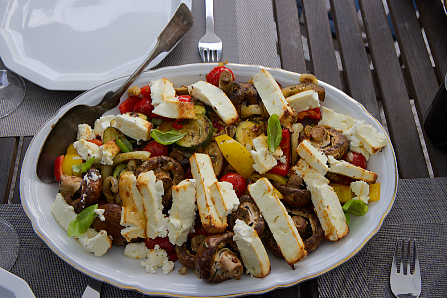 Das Wetter war prima und so konnten wir draußen sitzen und ließen uns verwöhnen. Es gab Kuchen und später gebratenes Gemüse mit Feta, dazu tranken wir einen alkoholfreien Rotwein (Doppio Passo), denn wir mussten ja noch Auto fahren. Das ist übrigens unser Lieblings-Rotwein, die alkoholfreie Variante schmeckt uns richtig gut!