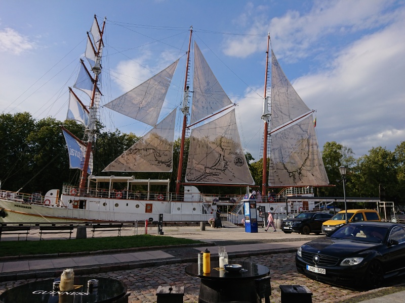 Wir sitzen gerade an der Dane, vor uns das alte Segelschiff Meridianas bei einem Kaltgetränk. Hier wird sogar Gaffels Kölsch angeboten, aber nur in 0,4!- Gläsern, alle anderen Sorten in 0.5.