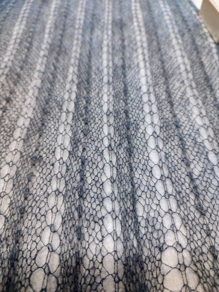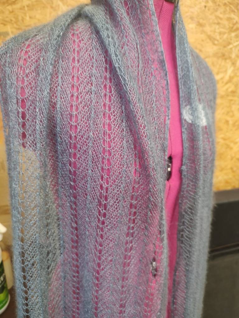 Gestrickt habe ich mit der Lamana Premia ( 60% Mohair/ 40% Seide)25 g laufen da ca 300 Meter, ich meine, ich habe 100 g verstrickt.