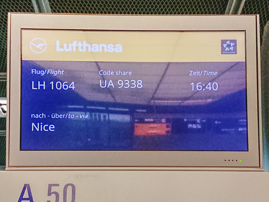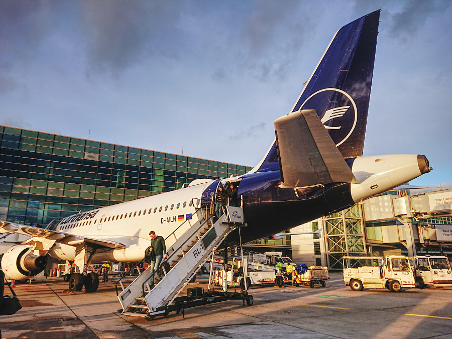 Der Flug nach Frankfurt war pünktlich, allerdings bekamen wir nur im Non-Schengen-Bereich einen Platz am Finger und mussten daher das Flugzeug über Treppen verlassen und mit dem Bus zum Terminal A fahren. Das war alles kein Problem, wir hatten ausreichend Zeit.