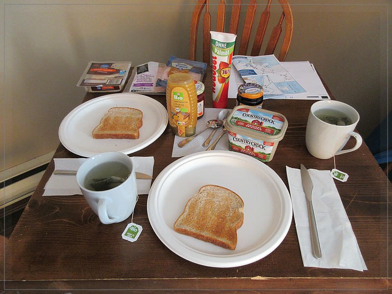 Da das Motel kein Frühstück anbietet, hatte ich ein Zimmer mit Kitchenette gebucht. Einige Frühstücksutensilien hatten wir von zu Hause mitgebracht, Toast und Margarine beim Walmart gekauft.