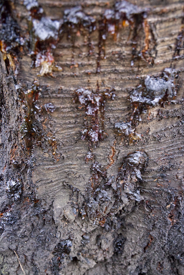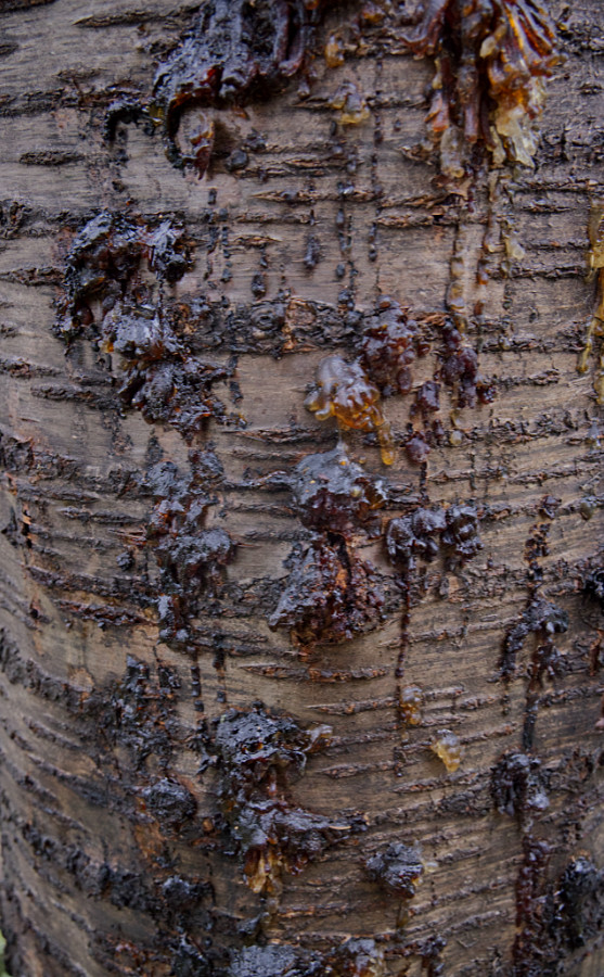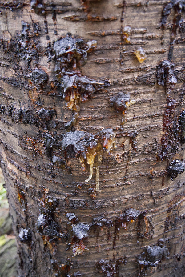 Als ich heute zum Kirschbaum gegangen bin, sah ich überall rund um den Stamm wabbeliges Harz liegen. Die Kirsche hat schon immer etwas geharzt, aber diese Menge ist doch sehr ungewöhnlich.