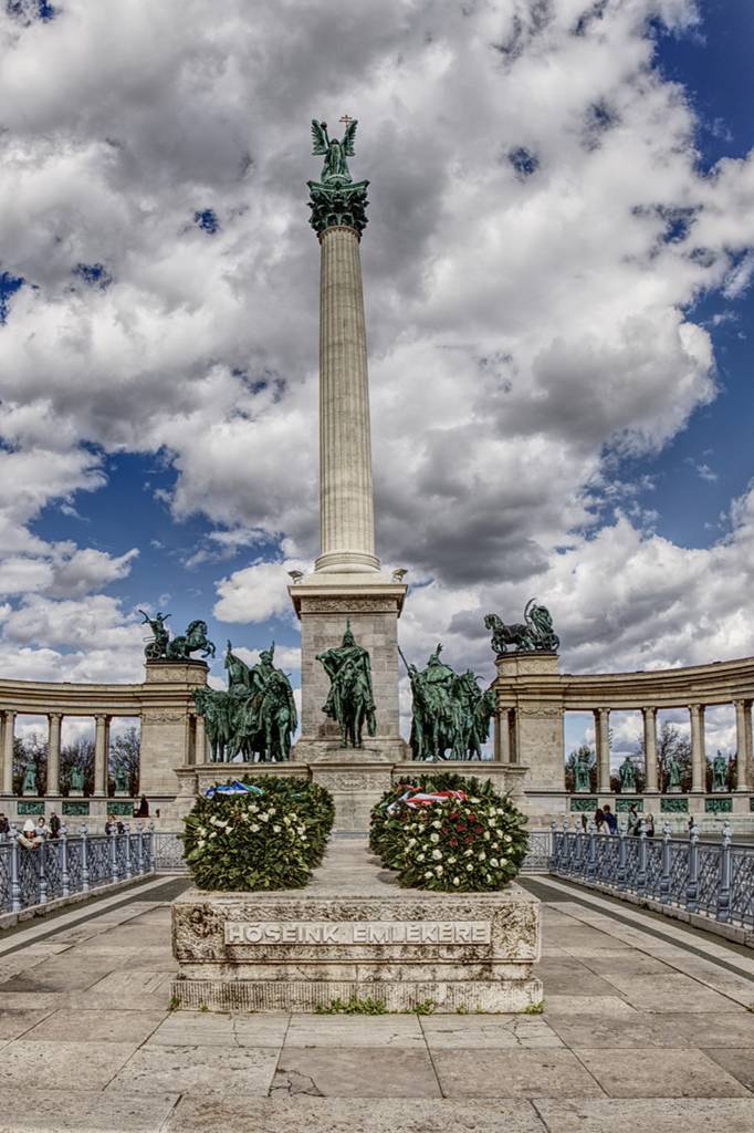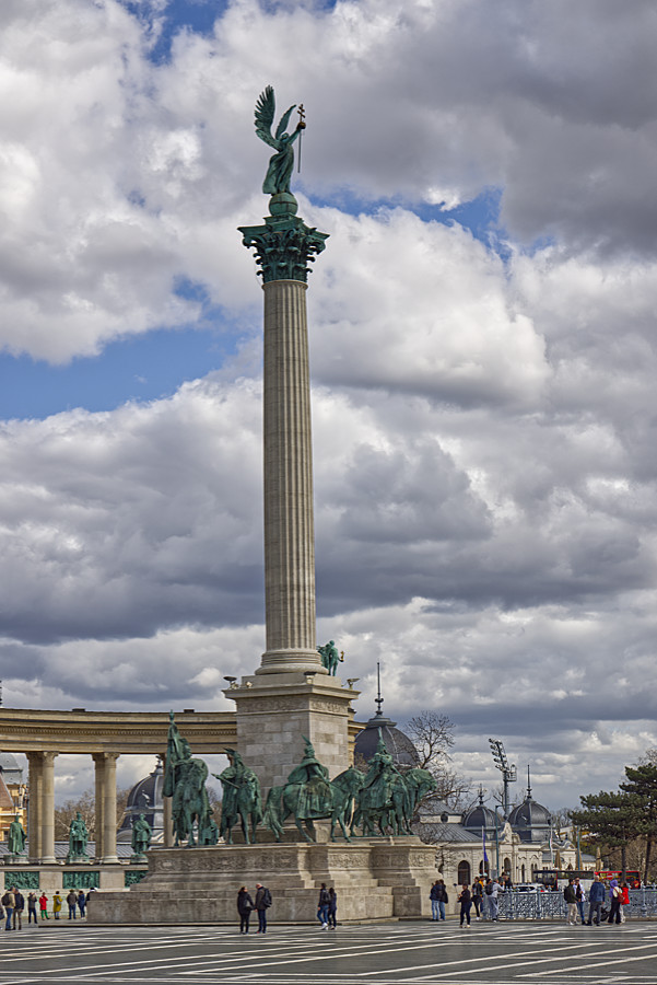 ZitatDas Parlament beschloss anlässlich der Tausendjahrfeier (magyarischen Landnahme von 896) ein Denkmal am Heldenplatz errichten zu lassen. Jedoch wurde das Monumentaldenkmal erst 1929 fertig. (gemeinsam geschaffen von dem Architekten Albert Schickedanz und dem Bildhauer György Zala) Auf der 36 m hohen Säule wacht der Erzengel Gabriel über die Reiterstatuen von Fürst Àrpád und sechs weiteren Stammesfürsten aus der Zeit der Landnahme. Zu Füßen der Säule befindet sich schlichter Steinquader mit der Aufschrift: Dem Gedenken der Helden, die ihr Leben der Freiheit unseres Volkes und der nationalen Unabhängigkeit geopfert haben.