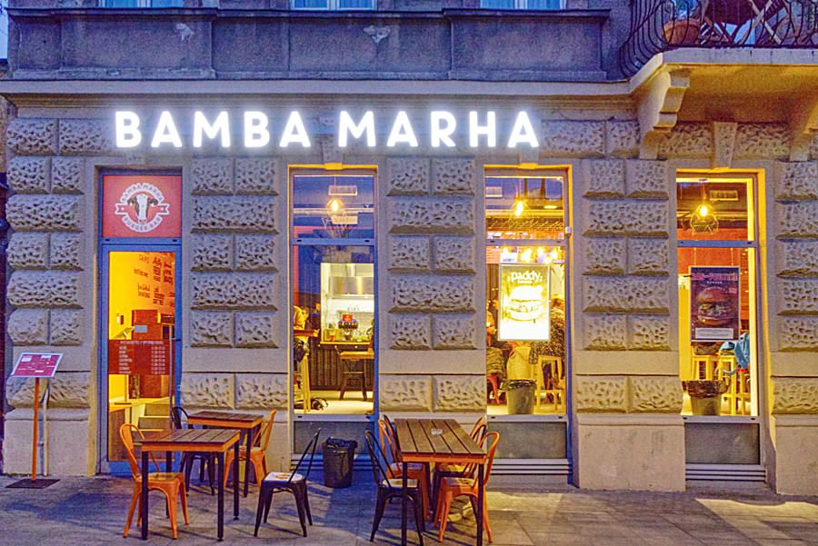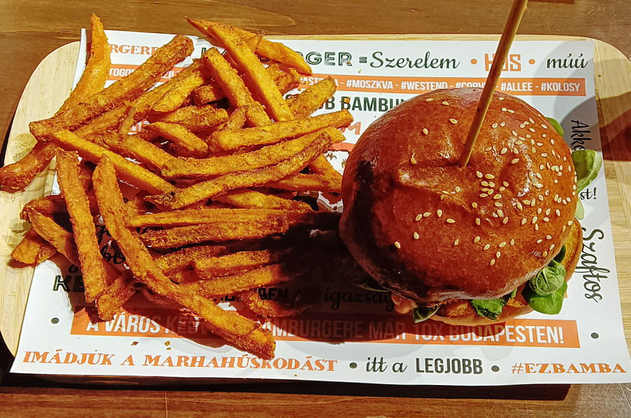 Das war allerdings keine so ansprechende Gegend, daher blieben wir sitzen und fuhren so lange, bis wir ein Metro-Schild durch die Scheibe entdeckten. Dort stiegen wir aus. Wir waren am Széll Kálmán tér angelangt. Von Weitem leuchtete die Burger-Bar- Reklame. Doch da gingen wir nicht rein und suchten ein anderes Lokal auf, nur ein paar Häuser weiter.Im Bamba Marha gab es einen unheimlich leckeren Ziegenkäseburger mit Süßkartoffeln-Pommes. Einziges Problem: wie soll man das Essen ohne Messer und Gabel, denn die gab es nicht, lediglich einen Spieß. Wir haben es geschafft, waren auch nicht sonderlich bekleckert.