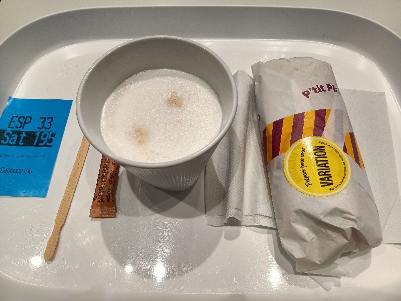 Jetzt ist das Wetter besser geworden und ich mache eine Pause mit Cappuccino und einem Ziegenkäsewrap.