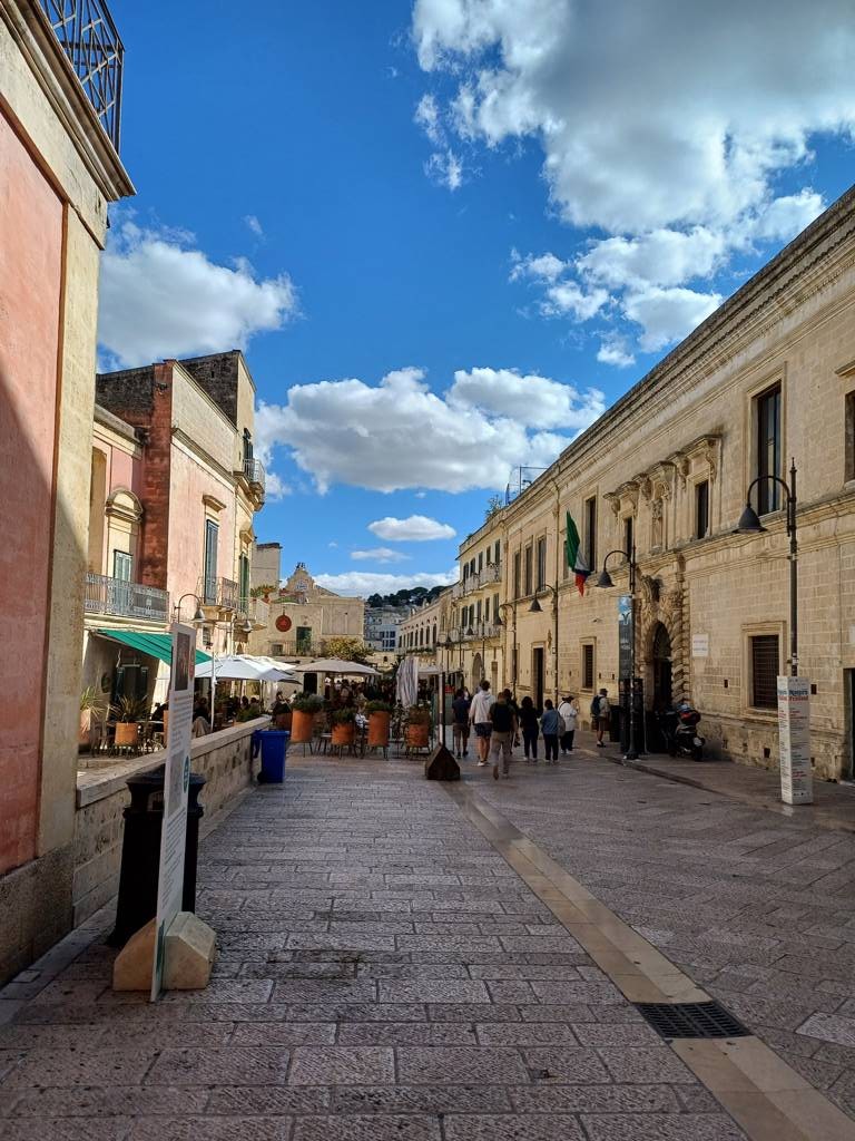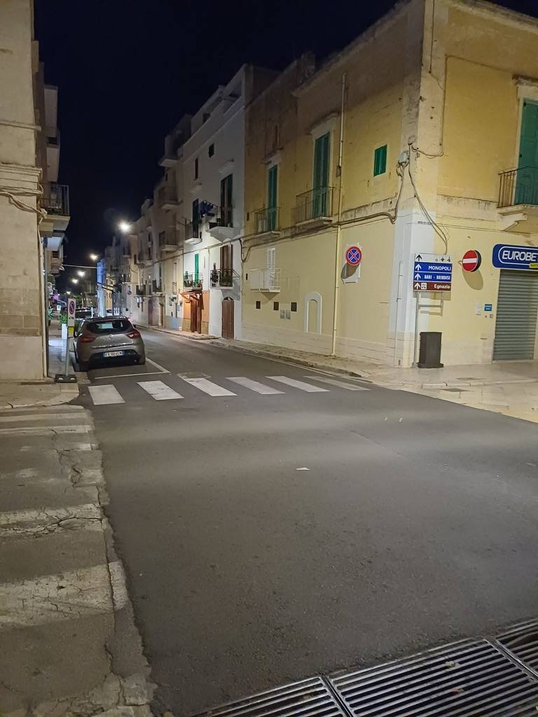 Iin Fasano gibt es zwei Restaurants, die glutenfreie Pizza anbieten, und die wird gebracht. Sie liegen beide dicht beieinander. Es ist eng in den Straßen in Fasano im Zentrum und ich bin froh, dass ich hier nicht AUto fahren muss. Am ENde der Straße, in dem das von uns favorisierte Restaurant liegt, finden wir tatsächlich einen Parkplatz und müssen nun ein ganzes Stück die Straße zurücklaufen. Ich vorweg. Jan als LEtzter., dazwischen unsere MItreisenden. Als ich diesen hier sichtbaren Zebrastreifen überquere kommt genau von, da , wo ich beim Foto machen jetzt stehe, ein Auto auf die Kreuzung zugerollt
