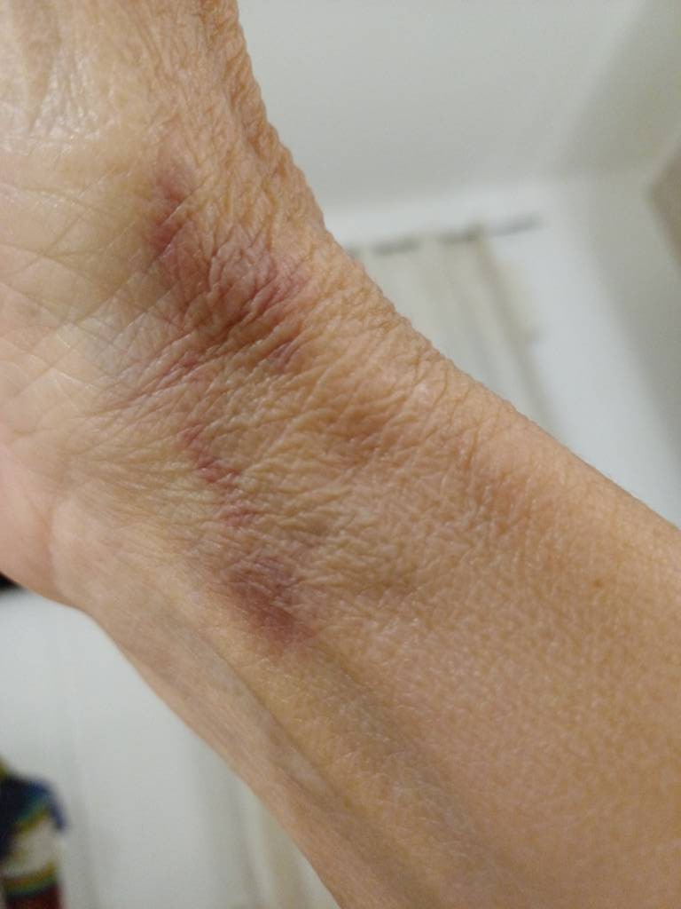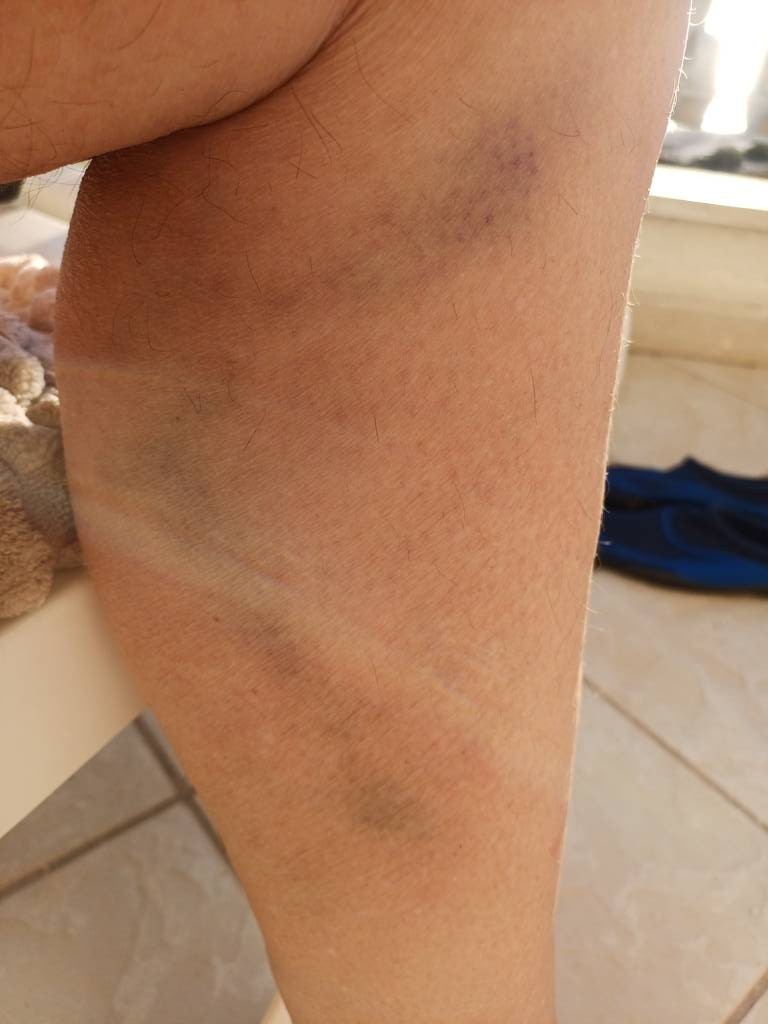 Mein Bein sieht mittlerweile so aus und an der Hand gibt es auch blaue Flecken, aber da tut nichts weh