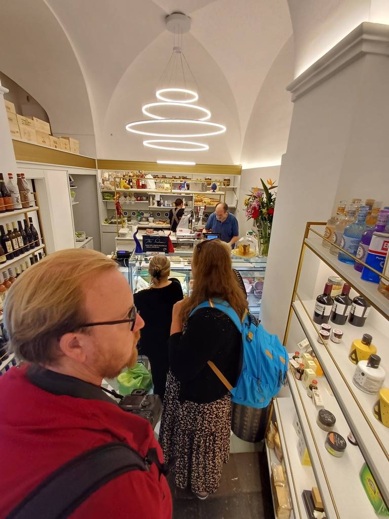 Der Zeitdruck lässt uns nicht richtig nachdenken - wir hätten hier für Okke auch einfach leckeren Schinken und Käse ohne Brot kaufen können... aber darauf kommen wir erst später. Stattdessen schicken wir ihn zu einer weiteren Anschrift auf dem Platz unterhalb der Kathedrale (wo er auch nichts zum MItnehmen bekommt) und ordern für uns andere drei drei belegte Panini - teuer, aber saulecker und gehaltvoll