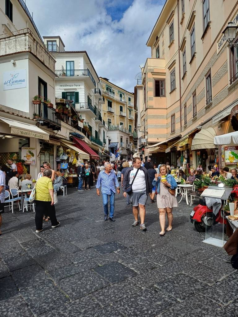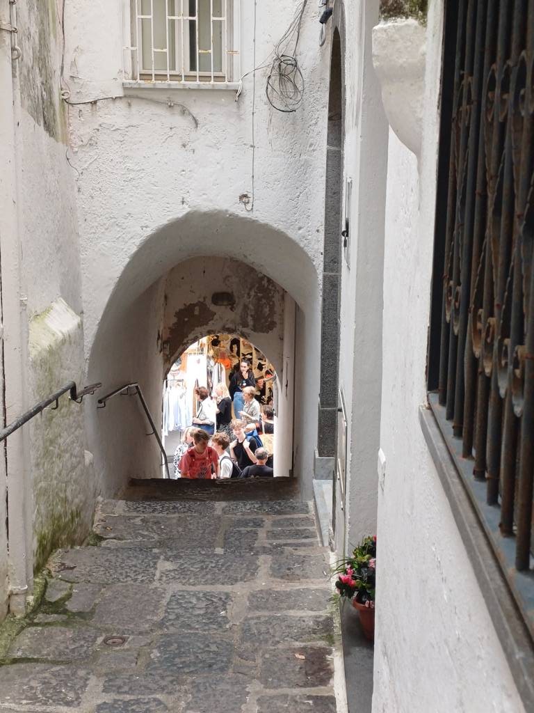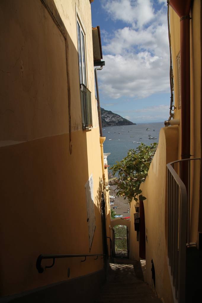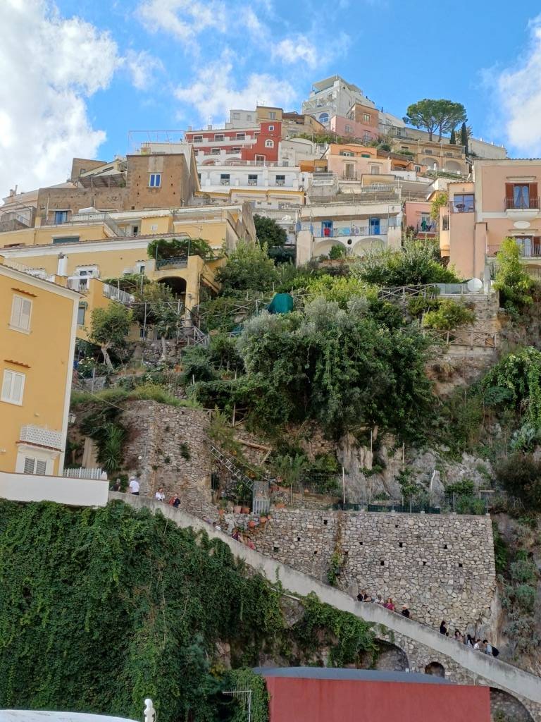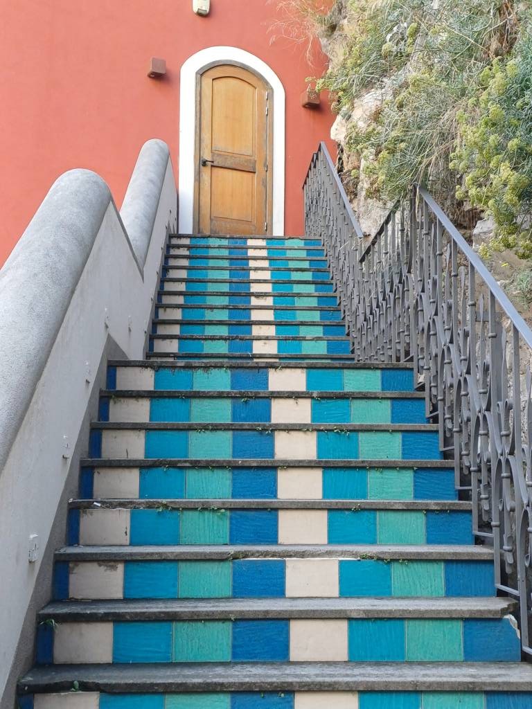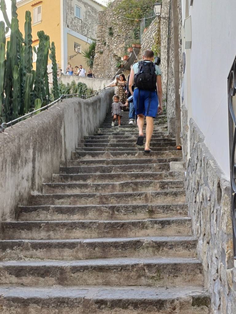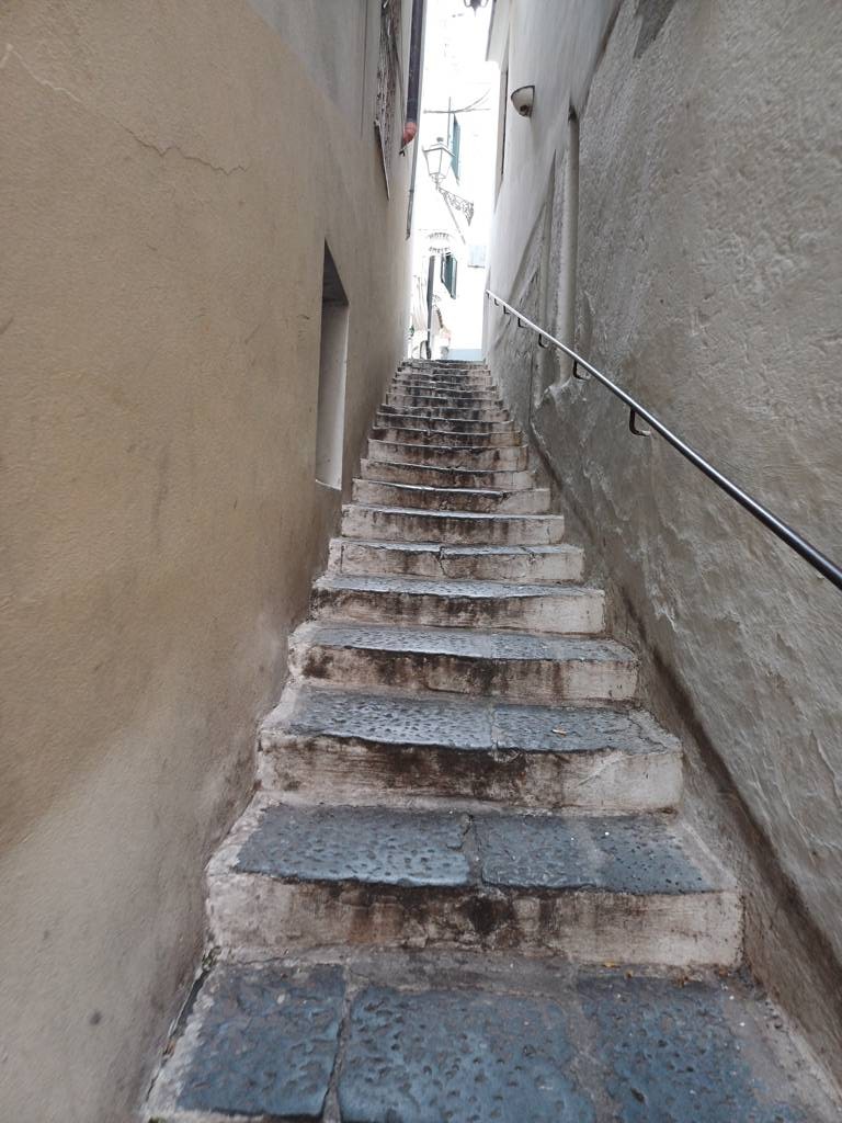 Auch in diesem Ort geht es mit Treppen in weitere Gebiete nach oben, die hier aber auch von mehr Touristen begangen werden, als in Amalfi. Ich entscheide mich für die linke Seite und gehe diese steile Treppe hoch, mit meinen Verletzungen eine Herausforderung
