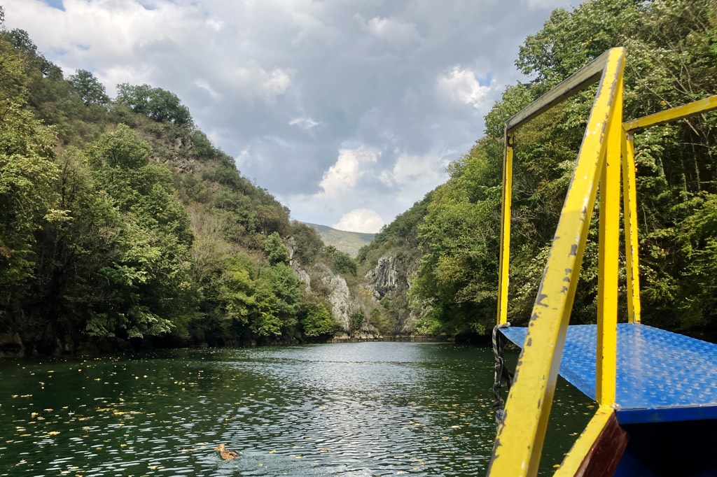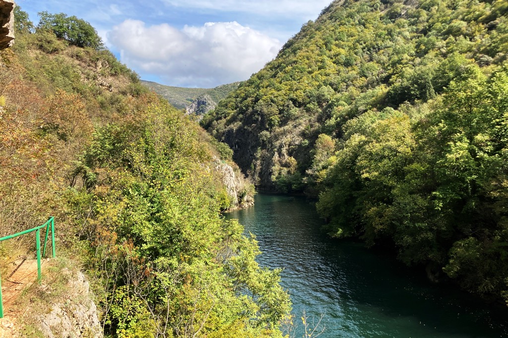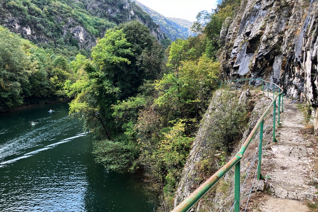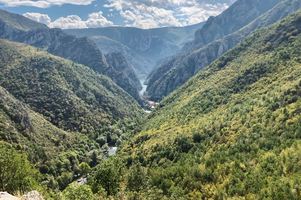 Unser erstes Ziel in Mazedonien ist der Matkacanyon. Als ich nach Zielen im Land guckte war die Gegend sofort gesetzt. Das Hotel ist ganz in Ordnung, es ist das einzige welches sich direkt im Canyon befindet und wenn die ganzen lãrmenden Tagesgäste endlich verschwunden sind, hat man auch abends seine Ruhe. Allerdings hat man auch keine andere Wahl als sich dort zu verpflegen. Zumindest bekommen Hotelgäste jeden Tag eine Flasche Wein umsonst zum Abendessen.