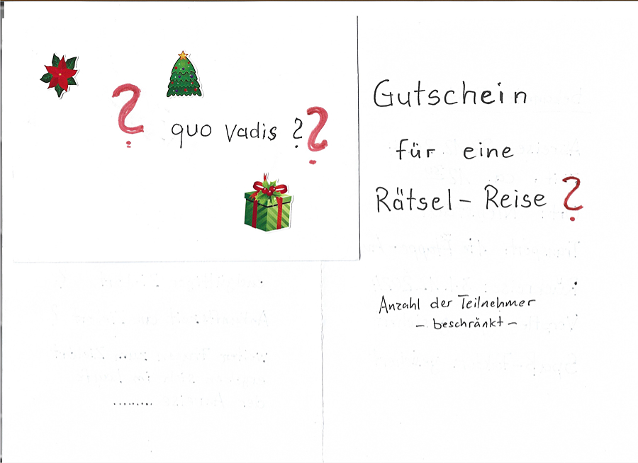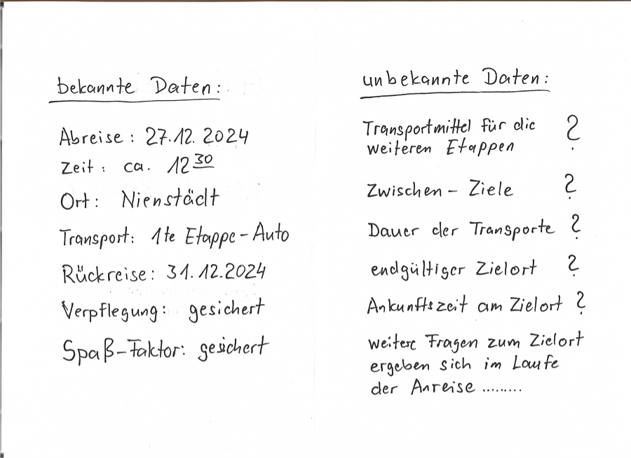 Zunächst gibt es die ersten Informationen, später stelle ich die Fragen hier rein, so dass ihr auch mitraten könnt. Dann werden wir aber schon unterwegs sein, so dass keine Gefahr besteht, dass jemand ihr das Ziel verrät.