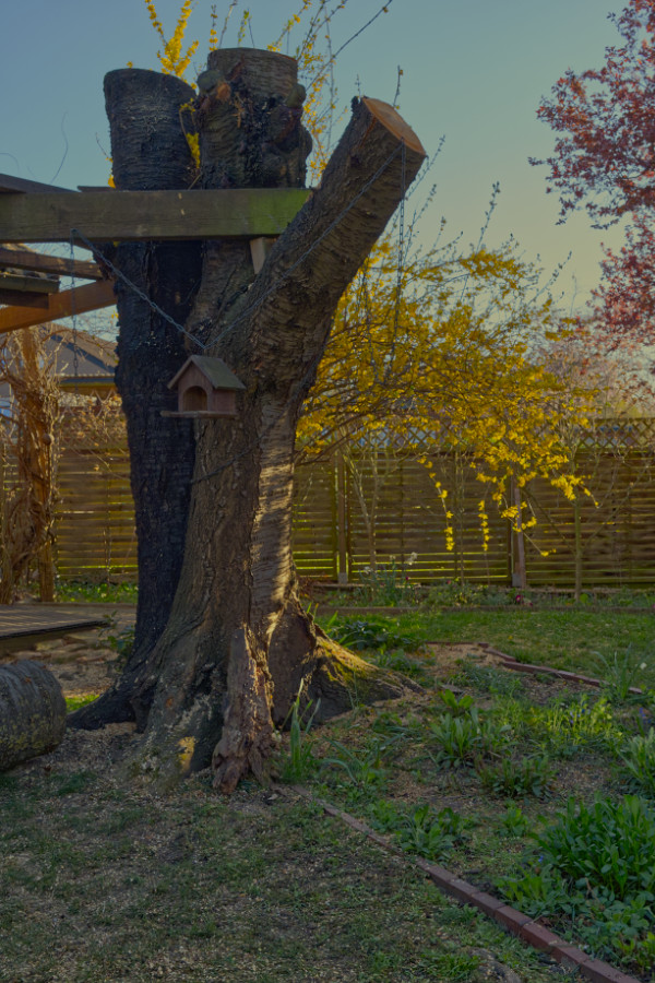 Heute wurden bei uns die Baumstämme der Kirsche gekürzt. Ich wollte gerne, dass so rund 3 m bleiben, denn ich möchte rund um den Stamm eine Rambler-Rose wachsen lassen.