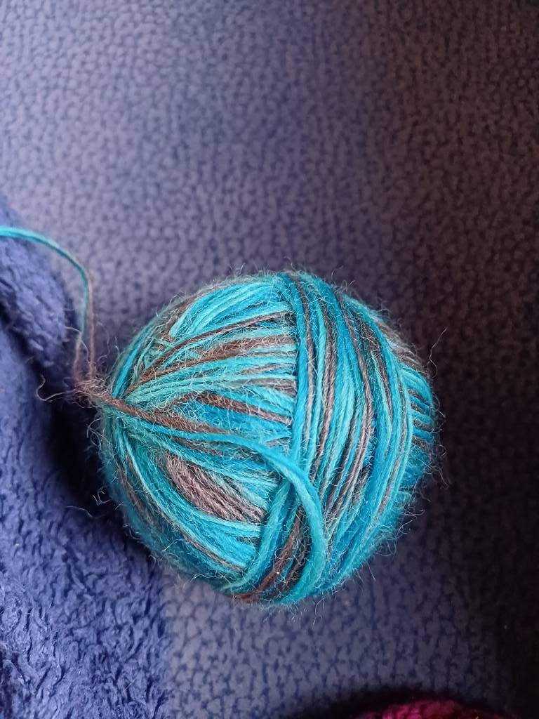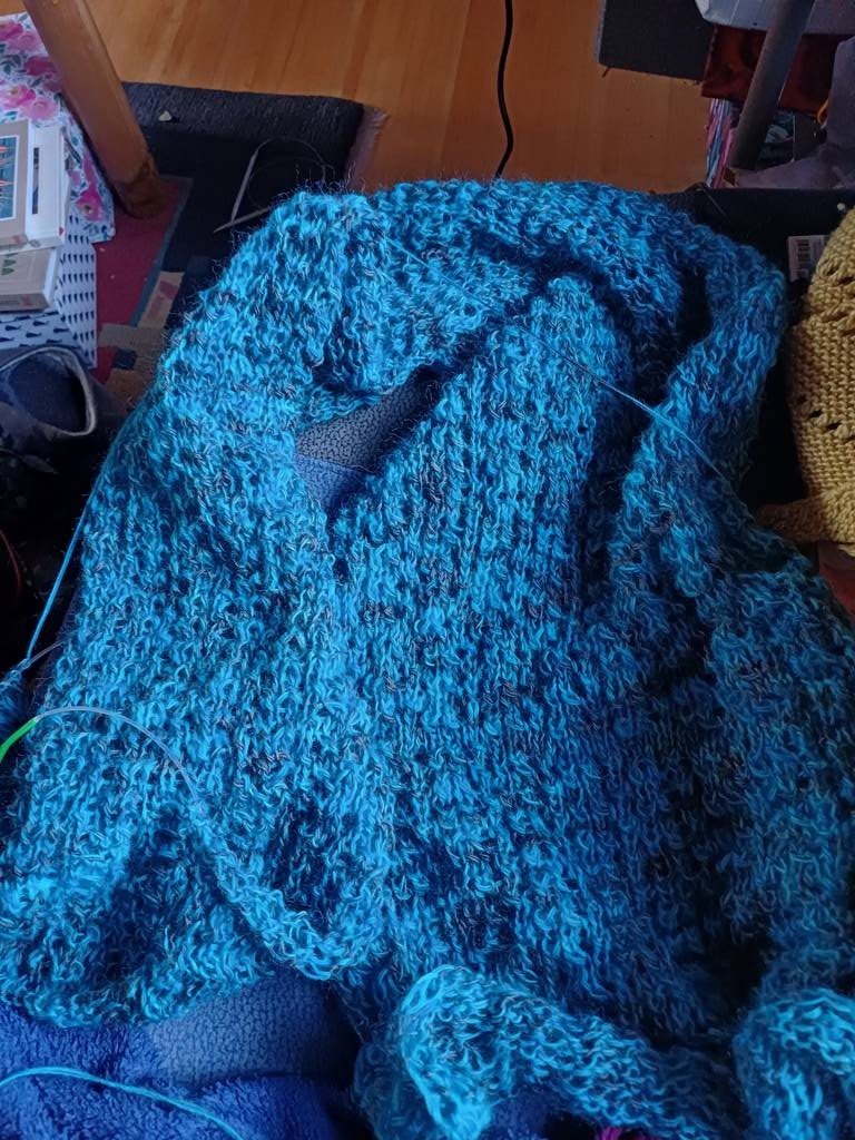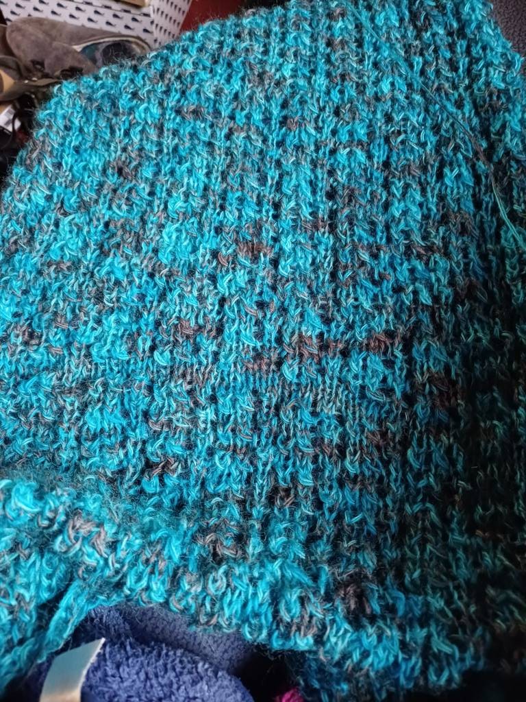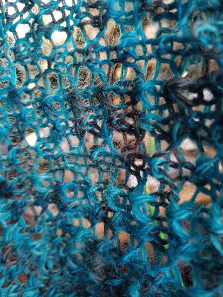 Ich stricke einen Schal mit Lochmuster. Man muss nicht viel nachdenken oder dauernd nach Muster schauen
