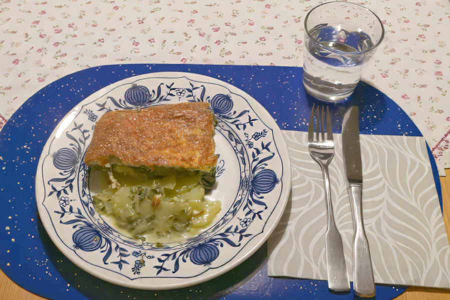 Nach 50 Minuten konnte ich den Auflauf aus dem Ofen holen. Das hat uns wieder mal richt gut geschmeckt. Da Friedrich auch ein guter Esser isst, gab es von der Menge 3 Portionen. So hat er morgen noch ein Abendessen.