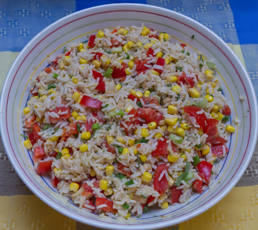 Reis, Paprika, Tomaten, Mais, Frühlingszwiebeln und Knoblauch, sowie einer Marinade aus Balsamico, Öl, Pfeffer und Salz. Alles mit Bio Veganer Thunvisch von followfood vermischen.