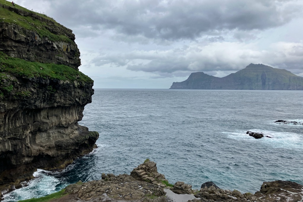 • In Gjogv hatten wir ebenfalls Glück und es war trocken. Wir machten uns auf den Weg auf den Hausberg an dessen Steilküste Papageientaucher und Möwen brüten. Nebenbei gab es auch schöne Aussichten.