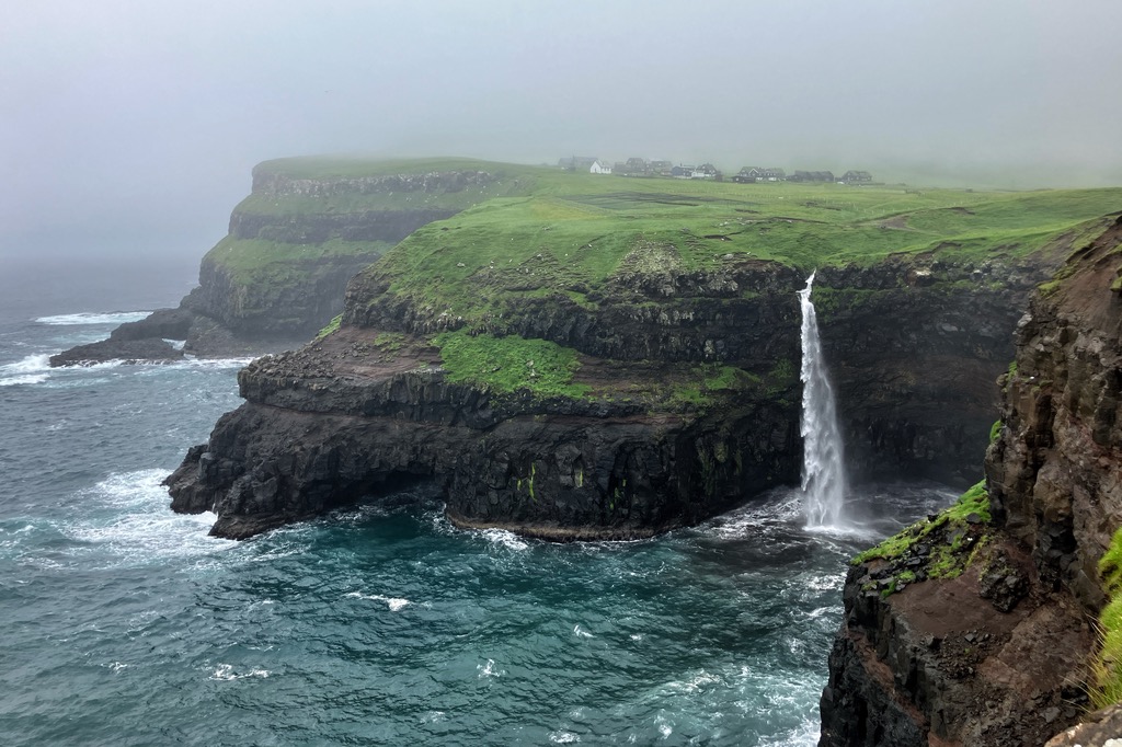 Wir suchten ein Café, aber am Sonntagmorgen war noch alles geschlossen. Da wir wenig Hoffnung hatten, daß sich hier das Wetter bessert, fuhren wir noch mal in den nördlichen Teil der Färöer. Erster Stop war die Schlucht von Gjogv, dort kann man Papageientaucher an der Steilküste beobachten, aber auch dort war es viel zu nass.