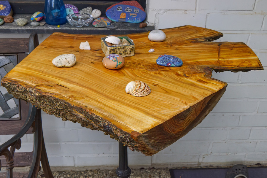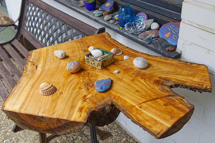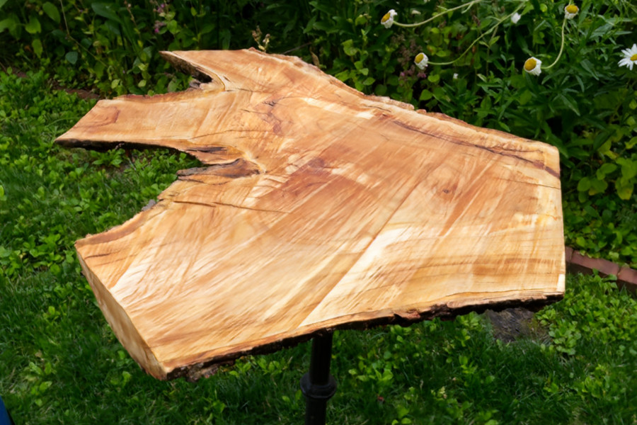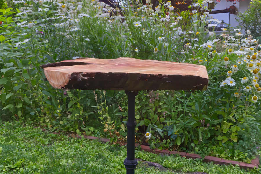 Als unser Kirschbaum im letzten Jahr gefällt wurde, haben wir aus dem Holz einige Platten schneiden lassen. Diese haben wir trocknen lassen und gestern hat Friedrich eine Platte auf einen alten Fuß geschraubt. Die Platte wurde erst grob, dann fein abgeschliffenen und zum Schluss mit Öl abgerieben.