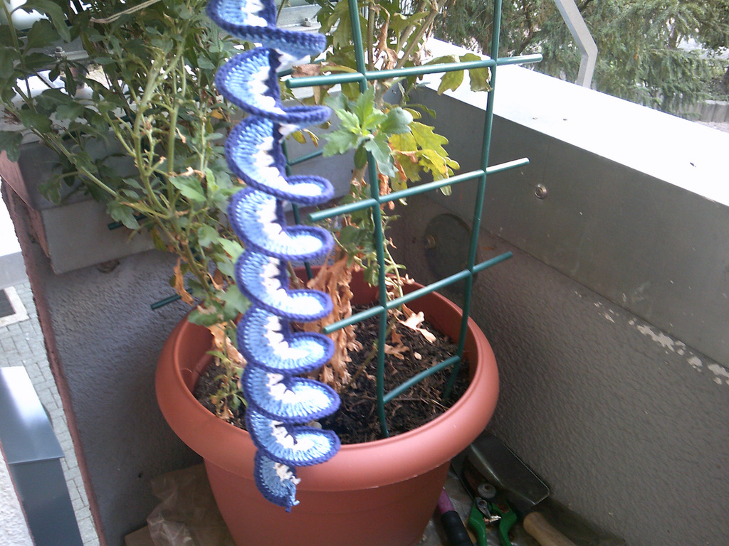Ich habe Reste von Acrylgarn,Strumpfwolle und auch Baumwolle genommen. Mein Balkon ist überdacht,muß meine Cousine fragen,sie hat sie auf der Terrasse hängen. Die Kettmaschen häkele ich mit 3,5 und dann geht es zu 2,5,die Anleitungen hole ich bei YouTube .