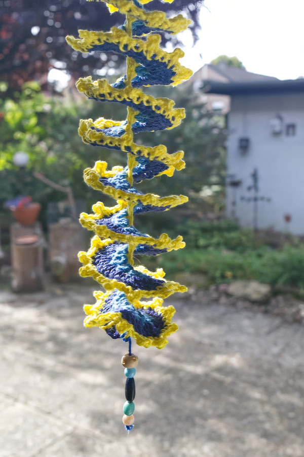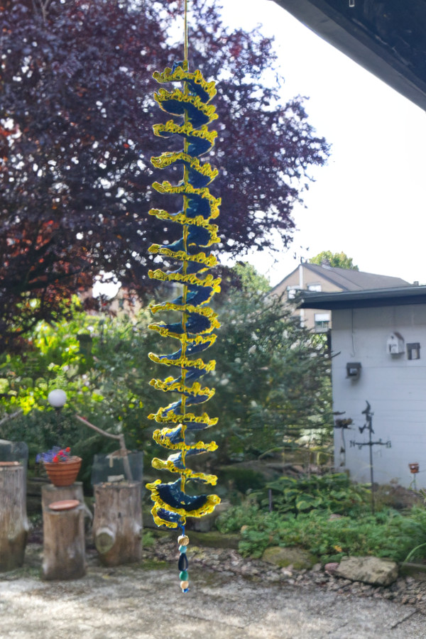 Mein Windspinner hängt. Ich habe ihn noch mit ein paar Glasperlen aus Indien verziert. und er dreht sich tatsächlich.