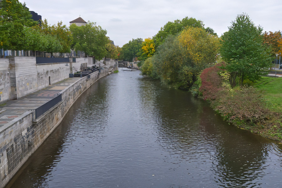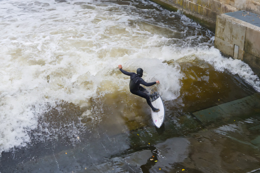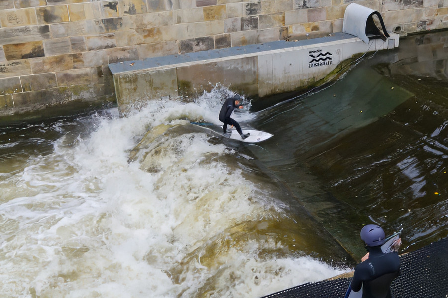 Als nächstes ging ich zur Leinewelle – ja auch in Hannover kann man seit 2023 in der Innenstadt Surfen. 🏄 Hier am Leinufer blieb ich ein Weilchen und schaute den Wellenreitern zu.