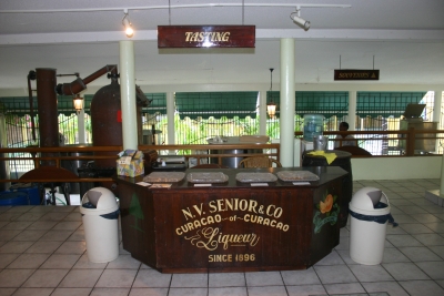 Und dann sollte man natürlich zur Ursprungsstelle des Curacao fahren, dem Landhaus Chobolobo, welches sich östlich von Punda im Stadtteil Salina befindet. Nur dort gibt es den echten Curacao. Das ganze Zeug, was man hier bei uns kaufen kann, ist nachgemacht und stammt nicht von Curacao. Man hatte seinerzeit versucht Orangenbäume aus Spanien anzupflanzen und lecker Orangen zu züchten. Aber der schlechte Boden und das Klima sorgten dafür, dass anstelle von prallen Orangen nur grüne mickrige Kugeln wuchsen. Diese schmeckten so bitter, dass selbst die Ziegen sie nicht mochten. Die Bäume wuchsen dennoch weiter. 1820 entdeckte jemand, dass man die Schale dieser Früchte, sofern sie lange genug in der Sonne trocknete, einen angenehmen Duft entwickelte. Dieser wird heute noch in einem mit Alkohol gestärkten Wasser gefangen und ist als MIttel zum Einreiben in der Karibik berühmt. Die Familie Senor experimentierte mit den Früchten und fand schließlich ein Rezept heraus, das den Curacao Likör zur Folge hatte. 1896 wurde in Europa ein Kupferkessel bestellt, der bis heute seinen Dienst als Herz der Likörbrennerei tut. Mit dem Patentieren und weltweiten Vertreiben hatte es die Familie irgendwie nicht geschafft. Nach wie vor gibt es den echten Curacao, der unter dem Namen " The original Senior Curacao of Curacao Liqueur" nur dort in dem Landhaus bzw. auf Curacao. Eigentlich ist das Getränk durchsichtig oder leicht hellbraun. Alle anderen Farben werden durch Färbungen hervorgerufen. Bei uns stehen zuhause jetzt 5 kleine Flaschen mit 5 verschiedenen Farben - getrunken darf der nicht werden.... vielleicht irgendwann mal eine.Es gibt auch Variationen mit Kakao, Rum oder Schokoladengeschmack. Man kann in der Fabrik herumgehen, erhält Proben und kann natürlich dort etwas originelles einkaufen. Der Besuch lohnt allemal.