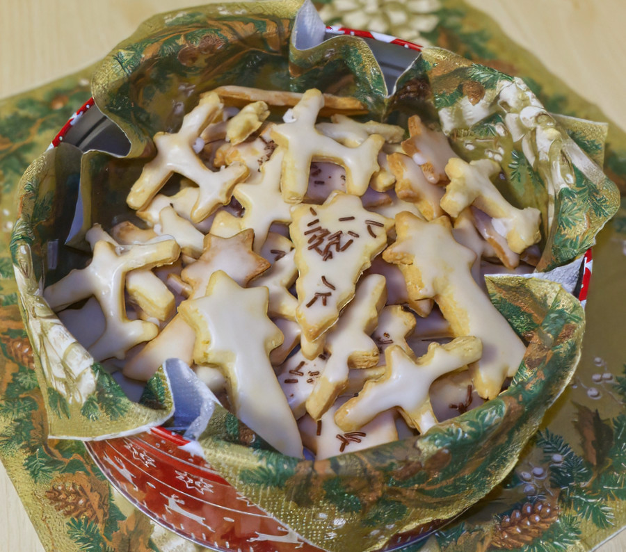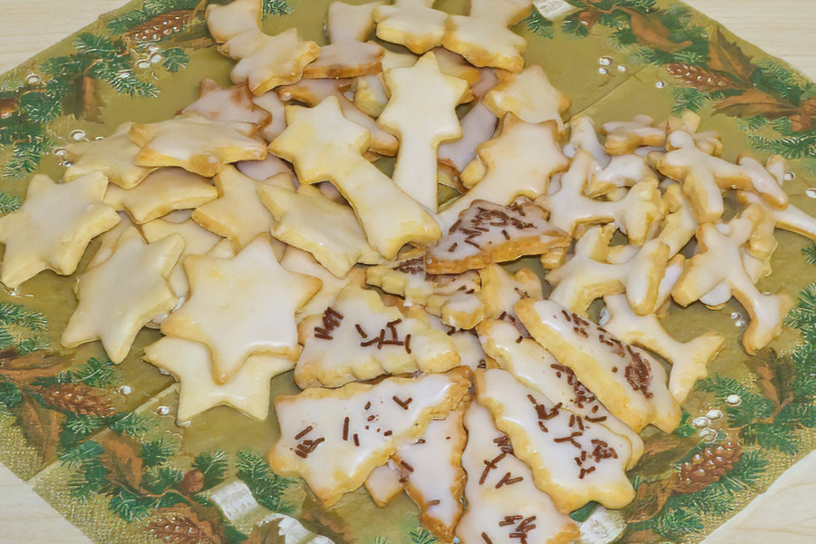 Nachdem die Kekse kalt geworden sind, habe ich sie noch mit einem Zitronenguss (nur Puderzucker und Zitrone) bestrichen.