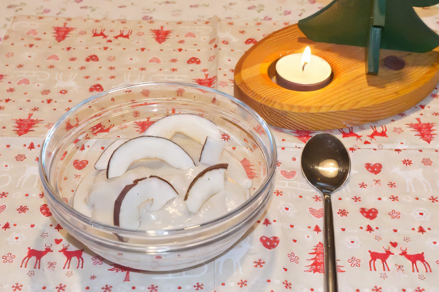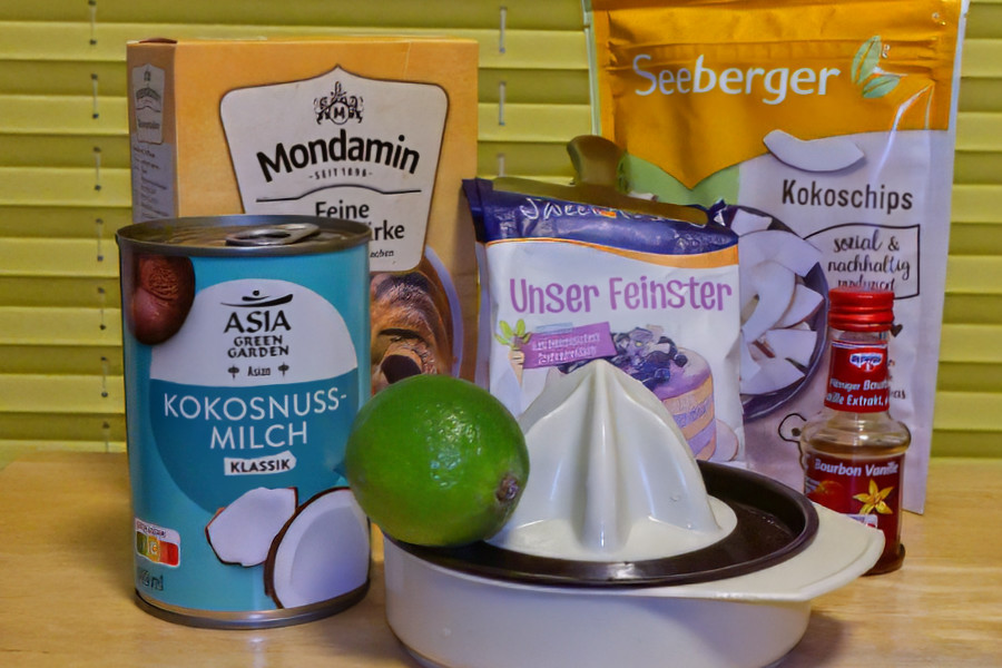 Heute habe ich das Dessert für unser Weihnachtsmenu zur probe vorbereitet. Die Kokos-Limetten-Creme besteht aus Kokosmilch, Limettensaft und abgeriebener Schale, etwas Zucker, Vanille-Extrakt angedickt mit Speisestärke und mit Kokoschips verziert.