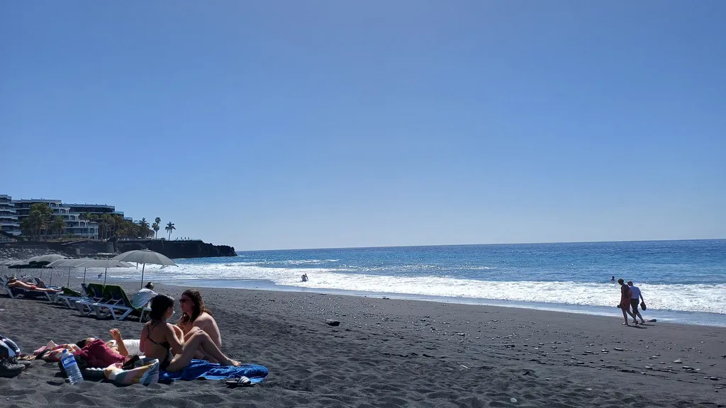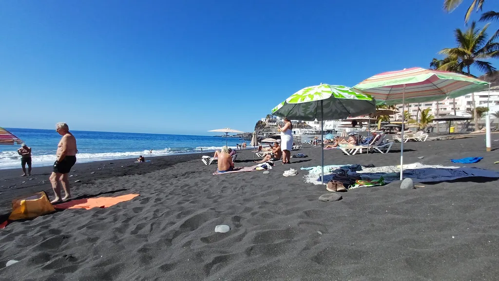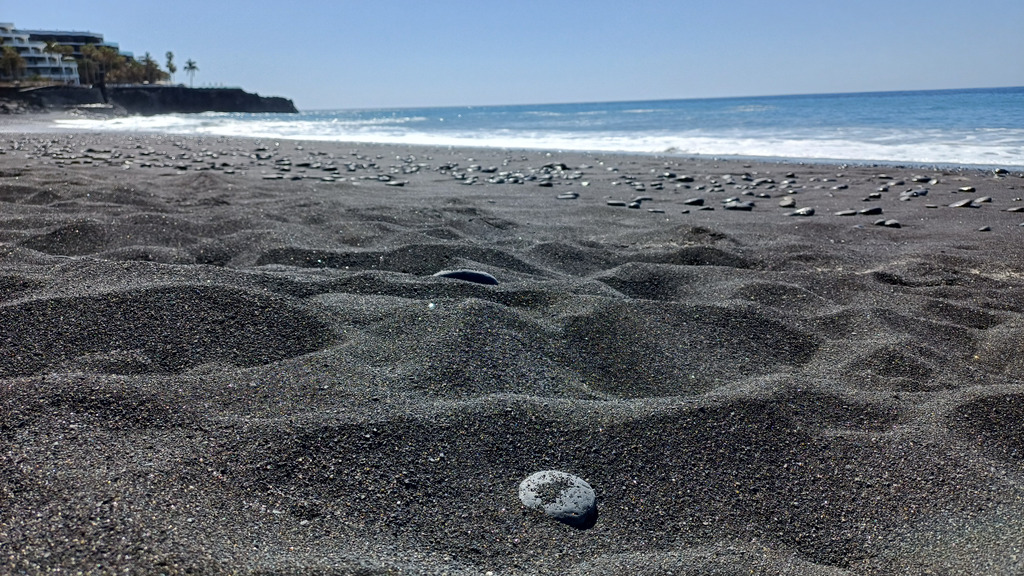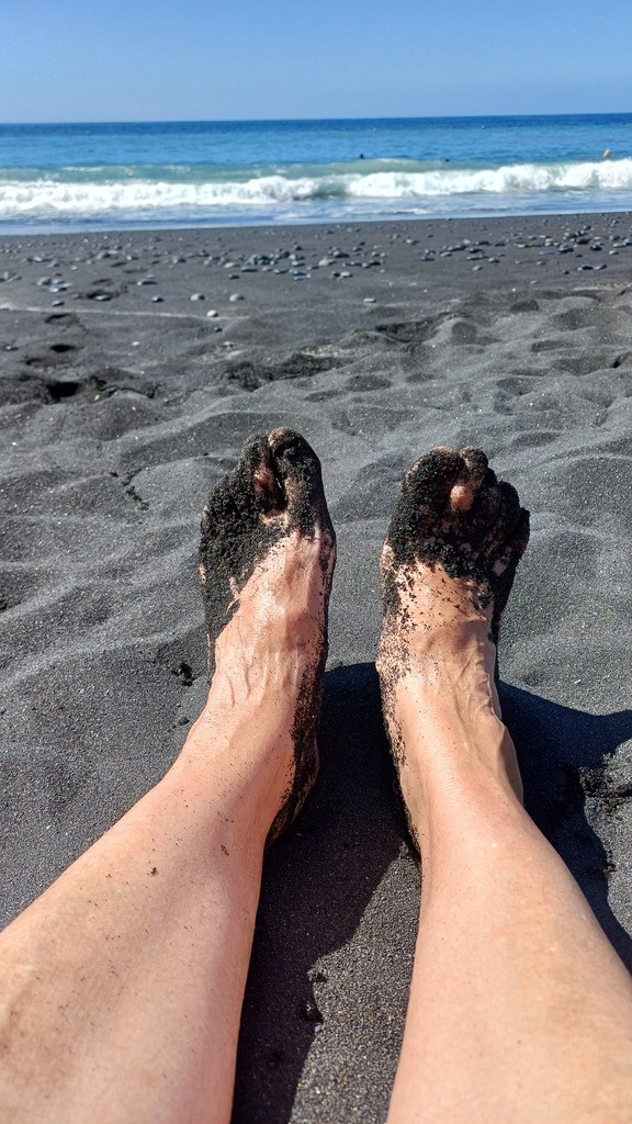 Und ich gehe auch ins Wasser - 18 Grad denke ich. Bei der Hitze hier auf dem schwarzen Sand erfrischend. Aber die Wellen, wenn auch nicht so hoch, sind tückisch und der Zug ins Wasser zurück massiv - mir ist das nicht ganz geheuer und nach kurzer Zeit gehe ich wieder raus. Dabei überrollt mich eine Welle, reißt mich um und ich habe bei der nächsten heransollenden Welle schon echt Schwierigkeiten aufzustehen - für Jan wäre das undenkbar.