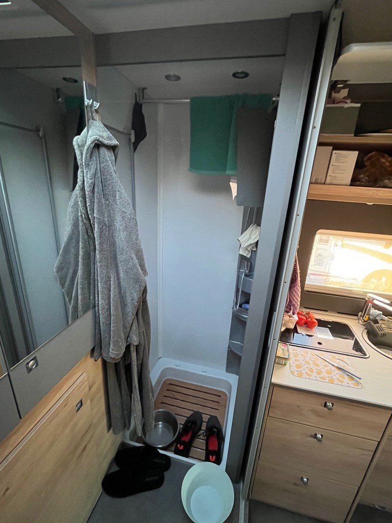 Es geht beides, man kann es höher lassen und per Leiter einsteigen oder es ganz runter fahren und dann bequem einsteigen.