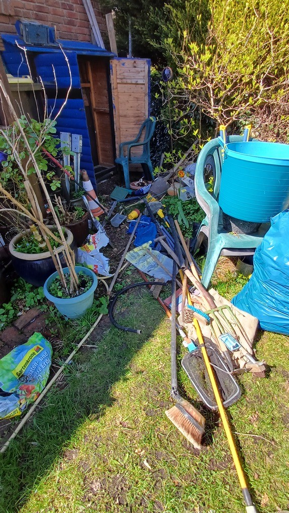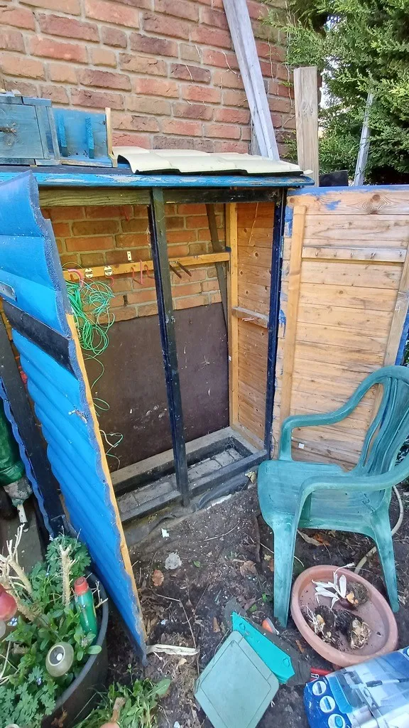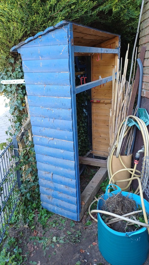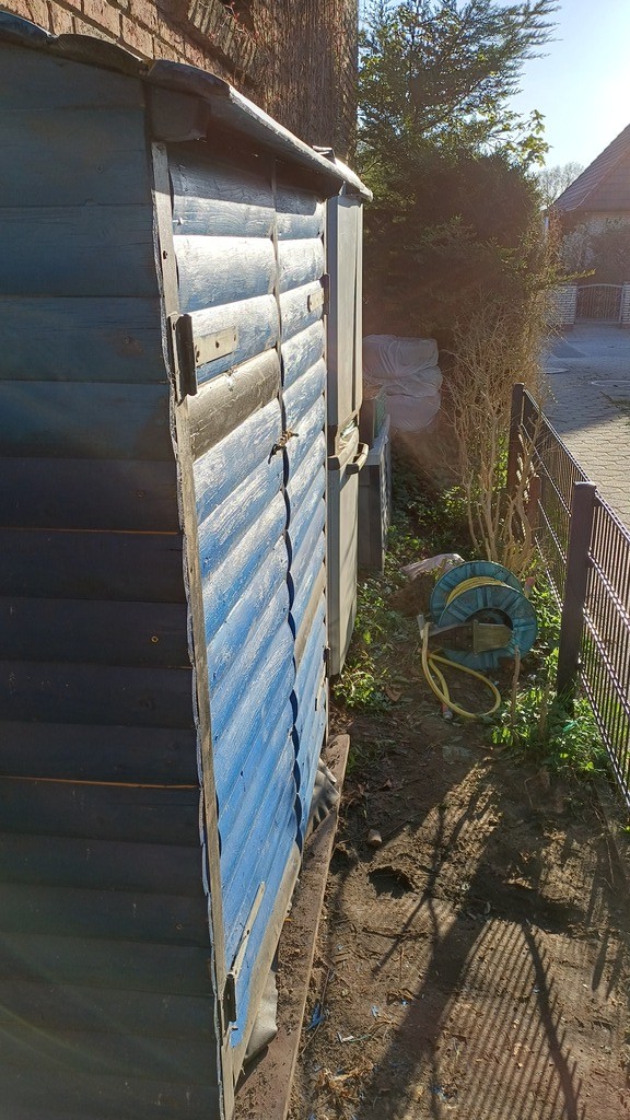 Jetzt an der Giebelseite den Giersch entfernen, kaputte Buchsbäume ausbutteln, Steine als Untergrund für den Boden legen, darauf 3 Eichenbretter aus unsrerer 1. Treppe, Boden fertig, Nun einen kleinen Schrank auf den anderen kleinen Schrank packen - Türen abschrauben vom Schrank und dann zerren, zerren, zerren um die Ecke...