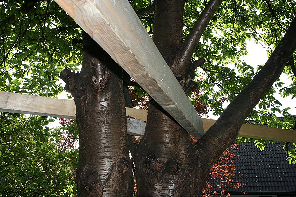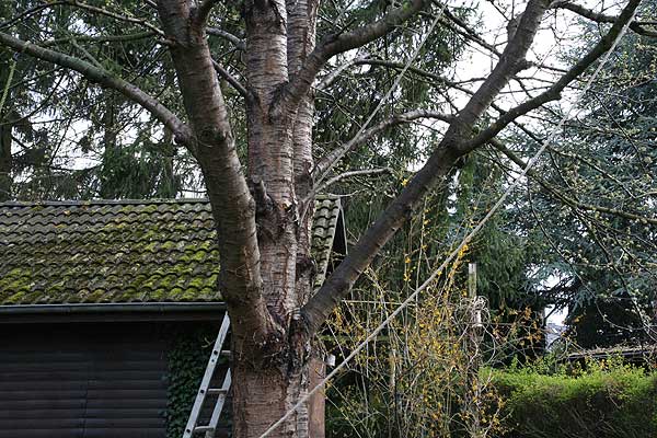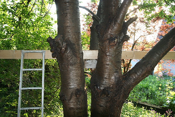 Unser Kirschbaum im Garten ist ideal. Nur müssen wir noch ein paar Äste abschneiden, damit das Baumhaus auch richtig in den vorhandenen Baum passt.