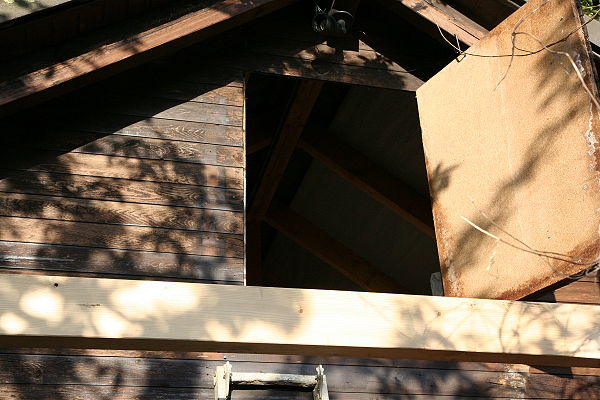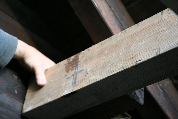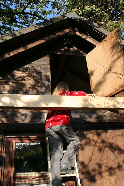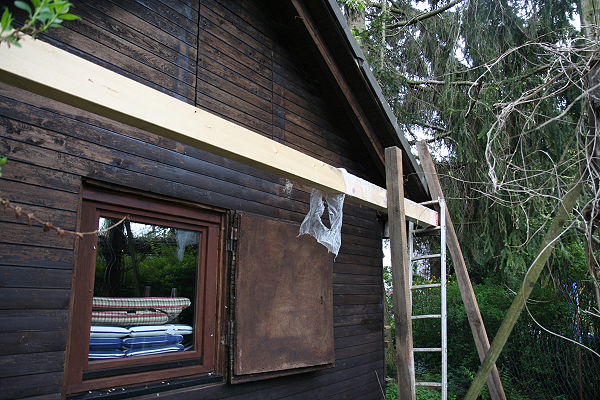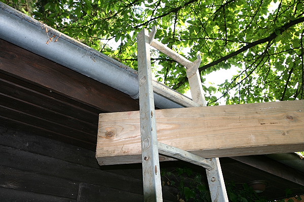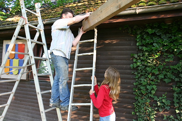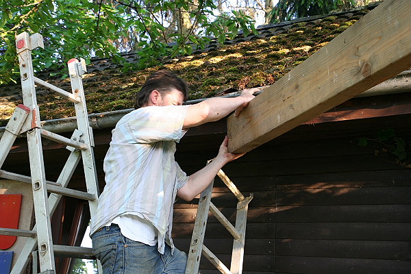 Als wir wussten, wo der Sparren war, mussten wir den schweren Balken in Position bringen. Das ging als erstes nicht, weil unsere Nachbarin sich unsere große Leiter geliehen hatte und diese unbedingt erforderlich war, um den Balken abzustützen. -