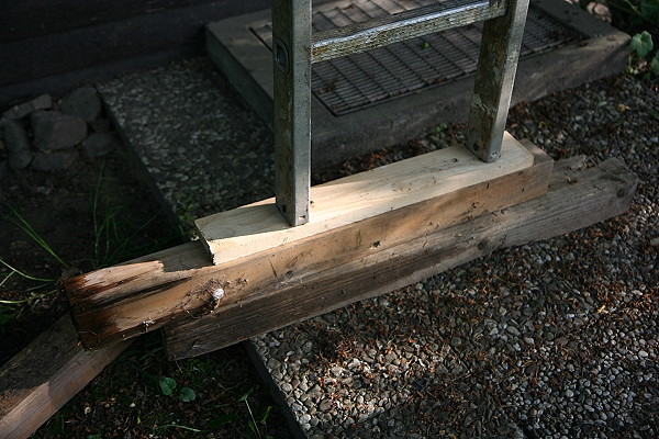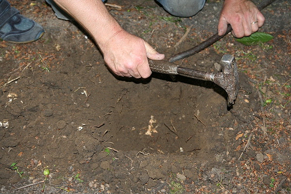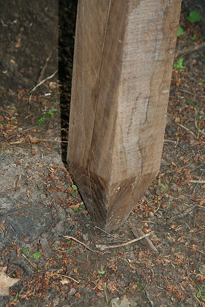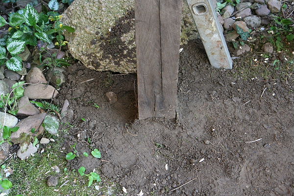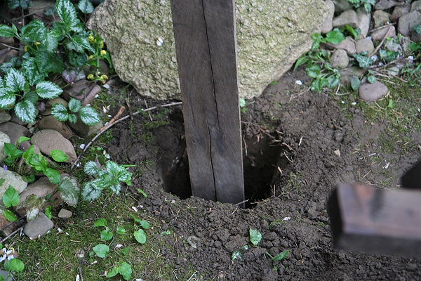 Als erstes befestigten wir ihn mit Hilfe einer Leiter einigermaßen waagerecht. Danach gruben wir ein Loch aus und stellten einen von Opas Holzpfählen hinein.